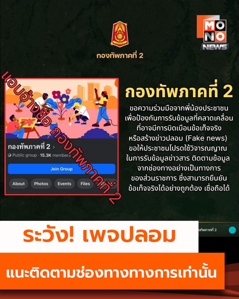 กองทัพภาคที่ 2 ยืนยันเพจเฟซบุ๊กปลอมไม่เกี่ยวข้อง ขอประชาชนติดตามเพจทางการที่มีเครื่องหมายติ๊กฟ้า ผู้ติดตามกว่า 2.5 ล้านบัญชี