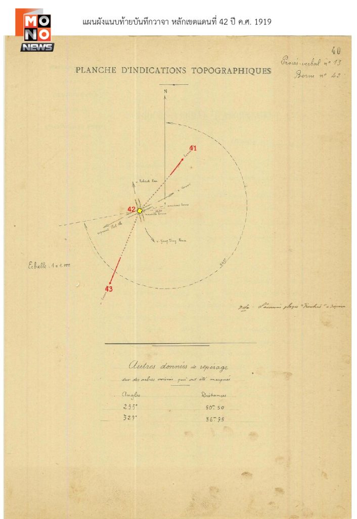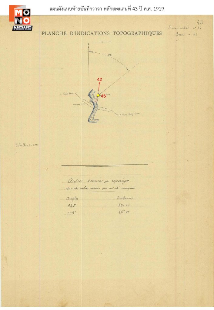 สำหรับบันทึกวาจาและแผนผังแสดงที่ตั้งหลักเขตแดนที่ 42 และ 43 เป็นบันทึกของข้าหลวงปักหลักเขตแดนระหว่างประเทศสยามกับอินโดจีนของฝรั่งเศส จัดทำขึ้นเมื่อปี ค.ศ. 1908–1909 โดยใช้ต้นไม้หรือเสาไม้ติดแผ่นโลหะเป็นหลักเขตแดน ต่อมาในปี ค.ศ. 1919–1920 ได้เปลี่ยนเป็นหลักคอนกรีตทดแทนซึ่งตั้งอยู่ใกล้กับหลักไม้หรือเสาไม้เดิม โดยในแผนผังแสดงที่ตั้งหลักเขตแดนของบันทึกวาจาทั้งสองห้วง ได้กำหนดแนวเขตแดนเป็นเส้นตรงระหว่างหลักที่ 42 และ 43 โดยแนวเส้นตรงดังกล่าวผ่านกึ่งกลางของหลักเขตแดนทั้งสองอย่างชัดเจน