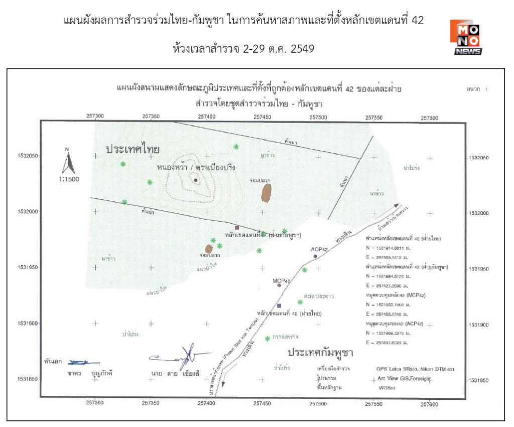 สำหรับกระบวนการสำรวจ ชุดสำรวจร่วมไทย–กัมพูชาได้ดำเนินการตามขั้นตอนที่ 1 ของ TOR คือ การสำรวจสภาพ และที่ตั้งของหลักเขตแดนทั้งหมด 74 หลัก ตั้งแต่ปี พ.ศ. 2549 โดยในส่วนของหลักเขตแดนที่ 42 ได้สำรวจเมื่อวันที่ 2–29 ต.ค. 2549 พบว่ายังอยู่ในสภาพดี แต่ทั้งสองฝ่ายมีความเห็นแตกต่างกันในเรื่องที่ตั้ง ประมาณ 80 เมตร ส่วนหลักเขตแดนที่ 43 ได้สำรวจเมื่อวันที่ 8 พ.ย.–12 ธ.ค. 2549 พบว่าหลักล้ม และถูกฝังอยู่ในดิน อย่างไรก็ตามทั้งสองฝ่ายสามารถตกลงที่ตั้งที่ถูกต้องร่วมกันได้ และได้สร้างหมุดชั่วคราว (Temporary Marker: TM) ไว้ ณ ตำแหน่งดังกล่าว