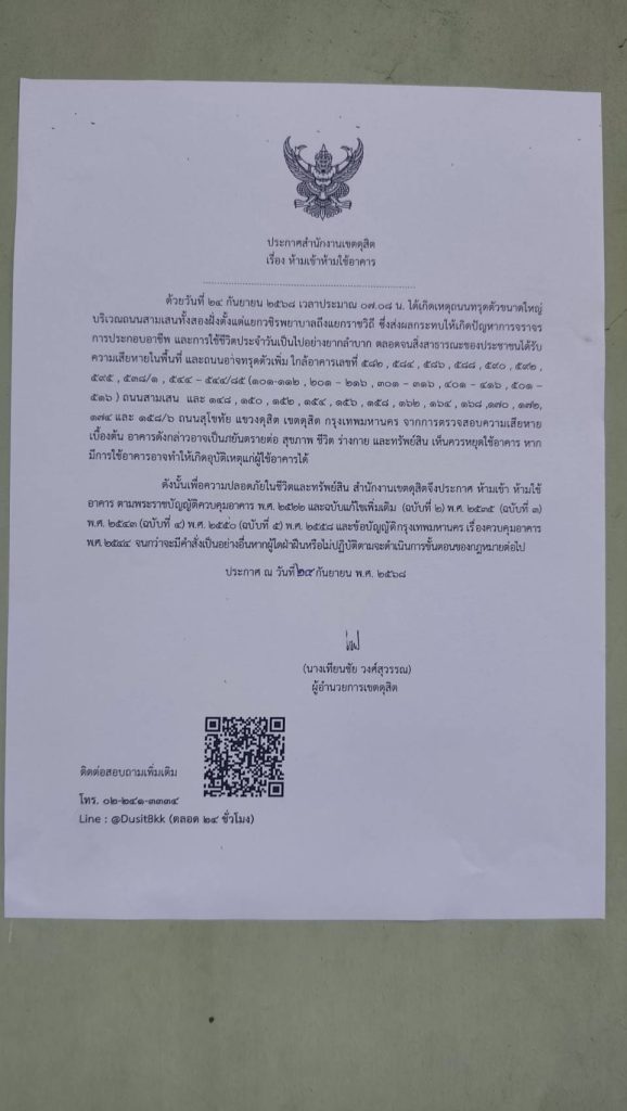 ดังนั้นเพื่อความปลอดภัยในชีวิตและทรัพย์สิน สำนักงานเขตดุสิตจึงประกาศ ห้ามเข้า-ห้ามใช้อาคาร ตามพระราชบัญญัติควบคุมอาคาร พ.ศ. 2522 และฉบับแก้ไขเพิ่มเติม (ฉบับที่ 2) พ.ศ. 2535 (ฉบับที่ 3) พ.ศ. 2543 (ฉบับที่ 4) พ.ศ. 2550 (ฉบับที่ 5) พ.ศ. 2558 และข้อบัญญัติกรุงเทพมหานคร เรื่องควบคุมอาคาร พ.ศ.2544 จนกว่าจะมีคำสั่งเป็นอย่างอื่นหากผู้ใดฝ่าฝืนหรือไม่ปฏิบัติตามจะดำเนินการขั้นตอนของกฎหมายต่อไป