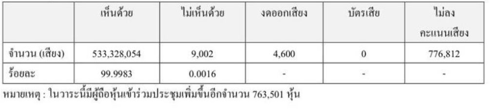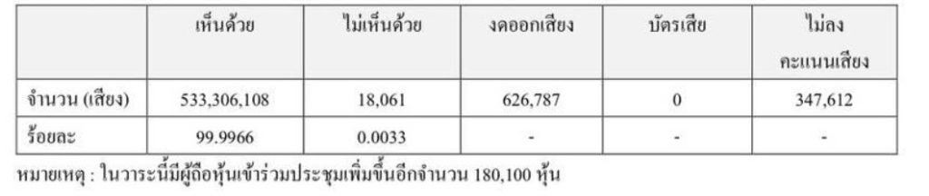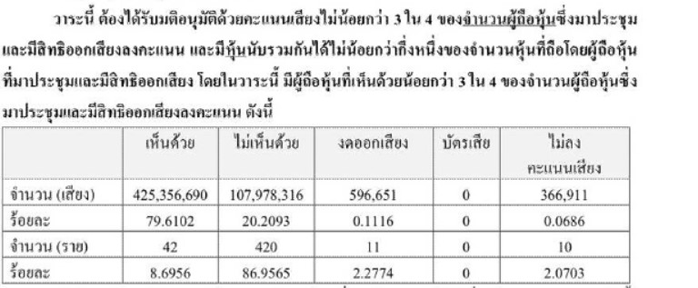 หมายเหตุ: อนึ่ง หลังจากการประชุมเมื่อเวลา 15.00 น. ได้มีผู้ถือหุ้นมาลงทะเบียนเพิ่มเติมเพื่อเข้าประชุม โดยมีผู้ถือหุ้นมาประชุมด้วยตนเองและโดยการมอบอำนาจรวมทั้งสิ้น 483 ราย นับจำนวนหุ้นได้รวมทั้งสิ้น 534,298,568 หุ้น คิดเป็นร้อยละ 62.8587 ของจำนวน 850,000,000 หุ้นที่จำหน่ายได้ทั้งหมดของบริษัท