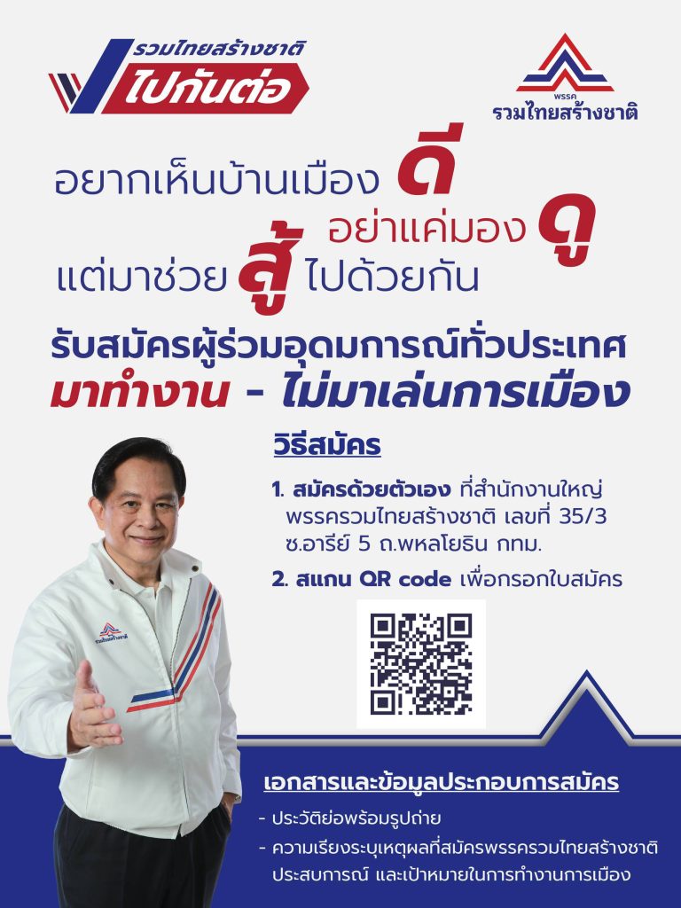 ตนขอถือโอกาสนี้เชิญชวนทุกคนที่มีแนวคิด มีความตั้งใจเหมือนตนและพรรครวมไทยสร้างชาติ มาร่วมทำงานด้วยกันโดยสามารถสมัครได้ 2 วิธี ได้แก่ วิธีที่ 1 สมัครด้วยตนเองที่พรรครวมไทยสร้างชาติ เลขที่ 35/3 ซอยอารีย์ 5 ถนนพหลโยธิน กรุงเทพฯ และวิธีที่ 2 คือ กรอกใบสมัครที่ลิงก์นี้ https://forms.gle/jwYGG9zNnGedtiqb7