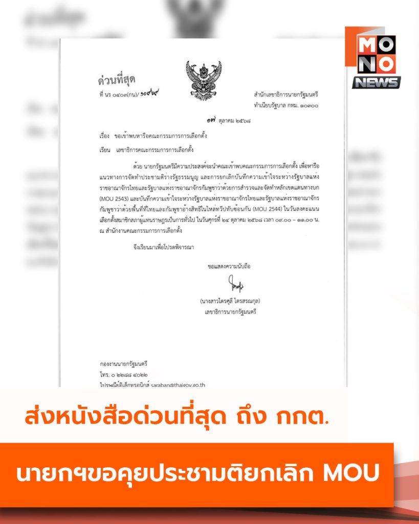วันนี้ (17 ตุลาคม) ที่ทำเนียบรัฐบาล นางสาวไตรศุลี ไตรสรณกุล เลขาธิการนายกรัฐมนตรี มีหนังสือ “ด่วนที่สุด” ถึงเลขาธิการคณะกรรมการการเลือกตั้ง (กกต.) แจ้งว่า นายอนุทิน ชาญวีรกูล นายกรัฐมนตรีและรัฐมนตรีว่าการกระทรวงมหาดไทย มีความประสงค์จะนำคณะเข้าพบเพื่อหารือแนวทางการจัดทำประชามติร่างรัฐธรรมนูญ และการยกเลิกบันทึกความเข้าใจระหว่างไทย–กัมพูชา ทั้งสองฉบับ ได้แก่ MOU 43 ว่าด้วยการสำรวจและจัดทำหลักเขตแดนทางบก และ MOU 44 ว่าด้วยพื้นที่ไหล่ทวีปทับซ้อนในอ่าวไทย