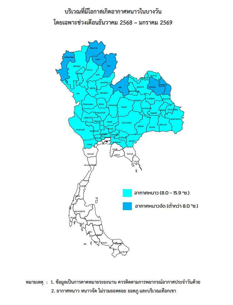 สำหรับอุณหภูมิโดยรวมในปีนี้ คาดว่าอุณหภูมิต่ำสุดเฉลี่ยบริเวณประเทศไทยตอนบนจะอยู่ที่ประมาณ 23 องศาเซลเซียส ซึ่งสูงกว่าค่าปกติ (19.9 องศาเซลเซียส) ประมาณ 1 องศาเซลเซียส แต่จะยังคงมีอากาศหนาวเย็นใกล้เคียงกับปีที่ผ่านมา ช่วงเวลาที่จะมีอากาศหนาวเย็นที่สุดคาดว่าจะอยู่ประมาณกลางเดือนธันวาคม 2568 ถึงต้นเดือนกุมภาพันธ์ 2569