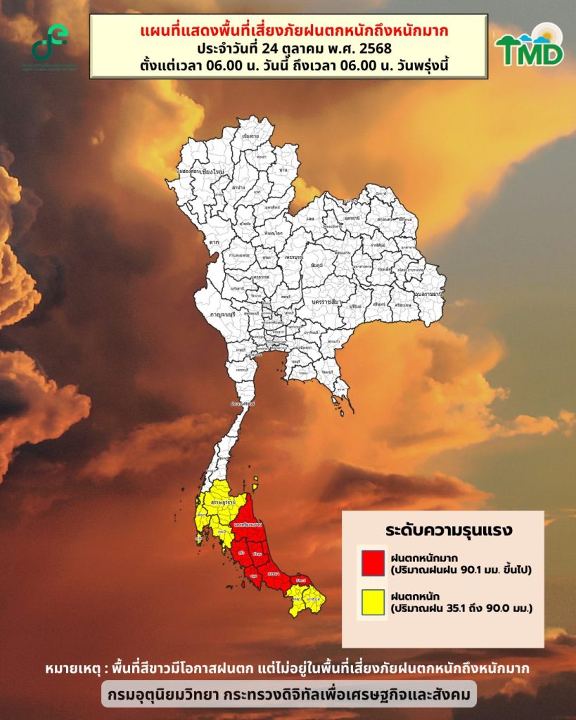 ร่องมรสุมกำลังปานกลางที่พาดผ่านภาคใต้ตอนล่างมีกำลังแรงขึ้น ประกอบกับมรสุมตะวันออกเฉียงเหนือพัดปกคลุมอ่าวไทยตอนบน ภาคใต้ตอนบน และทะเลอันดามันตอนบน ส่งผลให้ภาคใต้ตอนล่างมีฝนตกหนักถึงหนักมากบางแห่ง ขอให้ประชาชนในบริเวณดังกล่าว โดยเฉพาะในจังหวัดนครศรีธรรมราช พัทลุง สงขลา ปัตตานี ตรัง และสตูล ระวังอันตรายจากฝนตกหนักและฝนสะสม ซึ่งอาจทำให้เกิดน้ำท่วมฉับพลันและน้ำป่าไหลหลาก รวมถึงเพิ่มความระมัดระวังในการสัญจร