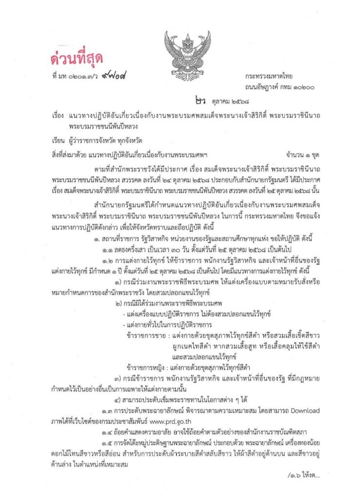 วันนี้ (26 ต.ค. 68) เวลา 21.00 น. นายอรรษิษฐ์ สัมพันธรัตน์ ปลัดกระทรวงมหาดไทย ได้มีหนังสือถึงผู้ว่าราชการจังหวัดทั่วประเทศ เกี่ยวกับการจัดกิจกรรมอันเนื่องกับงานพระบรมศพ สมเด็จพระนางเจ้าสิริกิติ์ พระบรมราชินีนาถ พระบรมราชชนนีพันปีหลวง ตามมติคณะรัฐมนตรีเมื่อวันที่ 25 ตุลาคม 2568 พร้อมทั้งให้แจ้งอำเภอ และองค์กรปกครองส่วนท้องถิ่นในพื้นที่ถือปฏิบัติเช่นเดียวกับจังหวัด ซึ่งมีสาระสำคัญเน้นย้ำถึง “การไม่ได้ห้ามหรือให้ระงับกิจกรรมใดเป็นการเฉพาะ” โดยประชาชนพิจารณาดำเนินการตามความเหมาะสม  ทั้งนี้ รัฐบาลขอความร่วมมือให้พี่น้องประชาชนและภาคเอกชนพิจารณาปรับรูปแบบการจัดกิจกรรมต่าง ๆ ให้เหมาะสมกับบรรยากาศแห่งความอาลัย