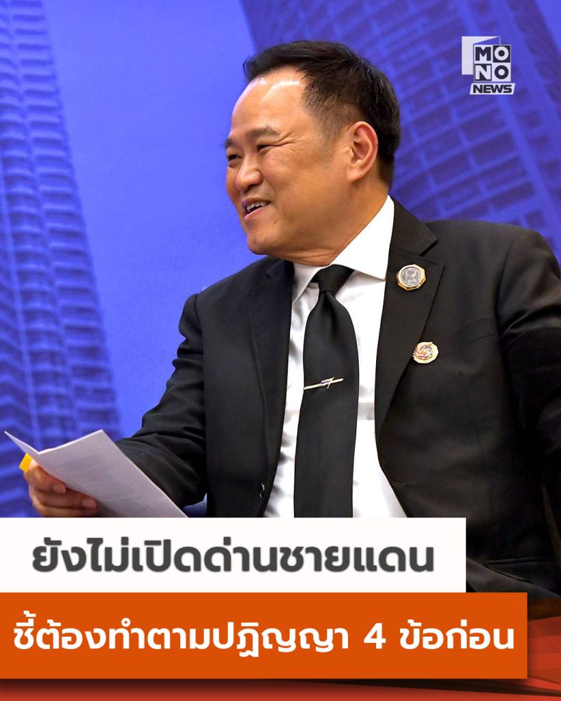 นายกรัฐมนตรี อนุทิน ชาญวีรกูล ยืนยันยังไม่เปิดด่านชายแดนไทย–กัมพูชา 1 พฤศจิกายนนี้ ชี้ฝ่ายกัมพูชาต้องดำเนินการตามปฏิญญา 4 ข้อ ทั้งถอนอาวุธหนัก กู้ทุ่นระเบิด ปราบแก๊งสแกมเมอร์ และฟื้นฟูความสัมพันธ์ทางการทูตก่อน