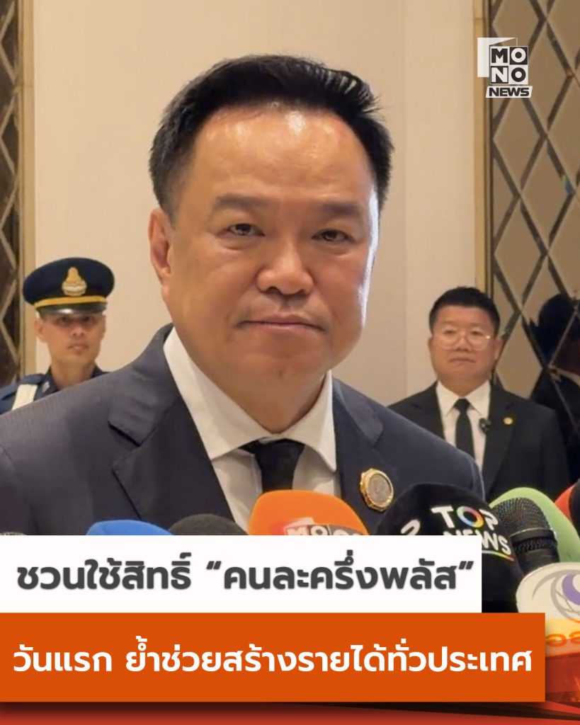 นายอนุทิน ชาญวีรกูล นายกรัฐมนตรี เชิญชวนประชาชนใช้สิทธิ์ “คนละครึ่งพลัส” วันแรก เพื่อกระตุ้นเศรษฐกิจทั่วประเทศ พร้อมยืนยันเฟส 2 มีแน่ ดูแลกลุ่มเปราะบางที่ไม่มีมือถือ เตือนอย่าทุจริตสแกนแลกเงินผิดกฎหมาย