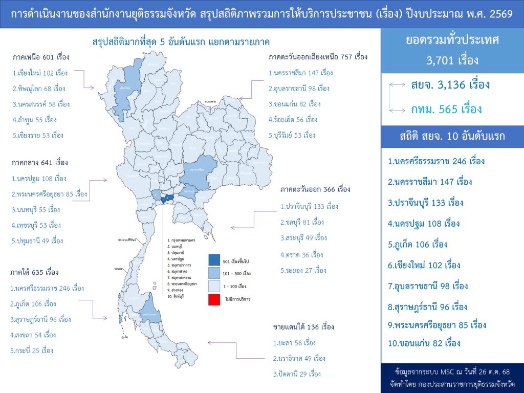 1 พ.ย. 2568 พล.ต.ท. รุทธพล เนาวรัตน์ รัฐมนตรีว่าการกระทรวงยุติธรรม เปิดเผยว่า ตั้งแต่วันที่ 1-26 ตุลาคม 2568 พบสถิติการให้บริการประชาชนของสำนักงานยุติธรรมจังหวัดทั่วประเทศ 81 แห่ง และ กทม. มียอดรวมกว่า 3,701 เรื่อง โดยจังหวัดที่มียอดการให้บริการประชาชน 10 อันดับแรก ได้แก่ 1.นครศรีธรรมราช 246 เรื่อง 2.นครนครราชสีมา 147 เรื่อง 3.ปราจีนบุรี 133 เรื่อง 4.นครปฐม 108 เรื่อง 5.ภูเก็ต 106 เรื่อง 6.เชียงใหม่ 102 เรื่อง 7.อุบลราชธานี 98 เรื่อง 8.สุราษฎร์ธานี 96 เรื่อง 9.พระนครศรีอยุธยา 85 เรื่อง และ 10.ขอนแก่น 82 เรื่อง