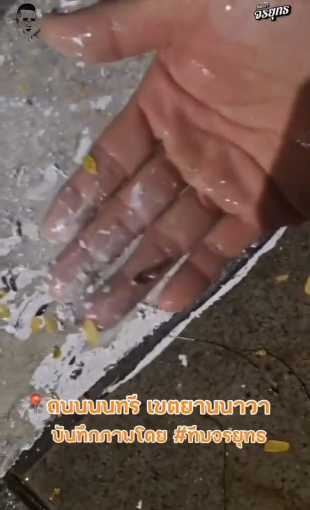 นี่คือภาพจริงจากถนนนนทรี ที่เห็นชัดว่ามีคราบสีแดงอมชมพูไหลลงท่อระบายน้ำ มันไม่ใช่แค่เรื่องความสกปรก แต่มันคือหลักฐานของการทำงานที่ไร้มาตรฐานและไร้ความรับผิดชอบ