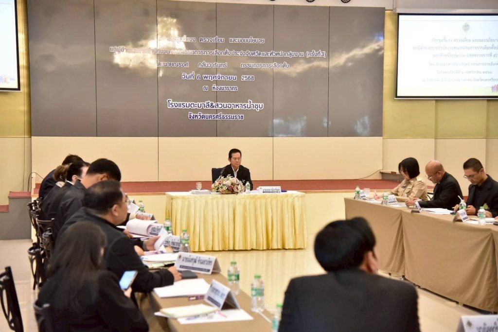 วันที่ 6 พฤศจิกายน 2568 เวลา 09.00 น. นายณรงค์ กลั่นวารินทร์ กรรมการ การเลือกตั้ง เป็นประธานในพิธีเปิดการประชุมชี้แจง ตรวจติดตาม และมอบนโยบายแก่ผู้อำนวยการสำนักงานคณะกรรมการการเลือกตั้งประจำจังหวัด และหัวหน้ากลุ่มงาน (ครั้งที่ 3) โดยมี นางวจิราพร อมาตยกุล รองผู้ว่าราชการจังหวัดนครศรีธรรมราช ให้การต้อนรับและกล่าวรายงาน ผู้เข้าร่วม การประชุมประกอบด้วย ดร.ณัฏฐพัฒน์ ธีรนันทวาณิช ที่ปรึกษาประจำกรรมการการเลือกตั้ง ดร.นฐินันต์ ศรีลาศักดิ์ ผู้เชี่ยวชาญประจำกรรมการการเลือกตั้ง นางสาวเสาวนีย์ จิระวุฒิกุล ผู้เชี่ยวชาญประจำกรรมการการเลือกตั้ง นายศิวะ เทพเจริญ ผู้เชี่ยวชาญประจำกรรมการการเลือกตั้ง นายวีระ ยี่แพร รองเลขาธิการคณะกรรมการการเลือกตั้ง นายเสน่ห์ รักรงค์ ผู้ตรวจการ เขตตรวจการที่ 5 พ.ต.ท.ระพีพงษ์ จิรพัฒนาลักษณ์ พนักงานตามสัญญาจ้าง นายสมเกียรติ คงดี เลขานุการประจำกรรมการการเลือกตั้ง ผู้อำนวยการหรือรองผู้อำนวยการสำนักงานคณะกรรมการการเลือกตั้งประจำจังหวัด หัวหน้ากลุ่มงานจัดการการเลือกตั้งและการมีส่วนร่วม หัวหน้ากลุ่มงานสืบสวนสอบสวนและพรรคการเมือง จำนวน 8 จังหวัด ได้แก่ จังหวัดนครศรีธรรมราช จังหวัดพังงา จังหวัดกระบี่ จังหวัดภูเก็ต จังหวัดสุราษฎร์ธานี จังหวัดชุมพร จังหวัดระนอง และจังหวัดประจวบคีรีขันธ์