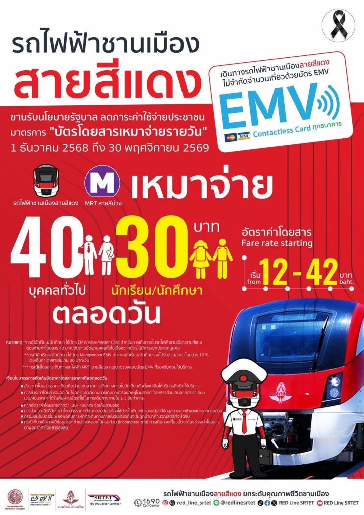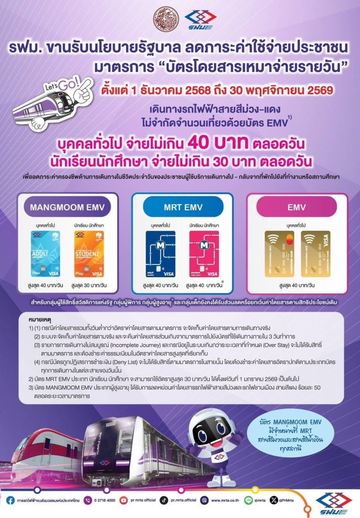 มาตรการดังกล่าวจะเริ่มตั้งแต่วันที่ 1 ธันวาคม 2568 ถึง 30 พฤศจิกายน 2569 ครอบคลุมการเดินทางด้วยรถไฟฟ้าสองระบบ คือ รถไฟฟ้ามหานคร สายสีม่วง ของการรถไฟฟ้าขนส่งมวลชนแห่งประเทศไทย (รฟม.) และรถไฟฟ้าชานเมือง สายสีแดง ของบริษัท รถไฟฟ้า ร.ฟ.ท. จำกัด (รฟฟท.–รฟท.) ประชาชนสามารถเดินทางเชื่อมต่อกันได้ทั้งสองระบบโดยไม่จำกัดจำนวนเที่ยวตลอดวัน โดยจัดเก็บค่าโดยสารสูงสุดไม่เกิน 40 บาทต่อวันสำหรับบุคคลทั่วไป และไม่เกิน 30 บาทต่อวันสำหรับนักเรียน–นักศึกษา ทั้งนี้ เมื่อผู้โดยสารใช้บริการจนถึงอัตราเหมาจ่าย ระบบจะคิดราคาสูงสุดตามสิทธิ์โดยอัตโนมัติ