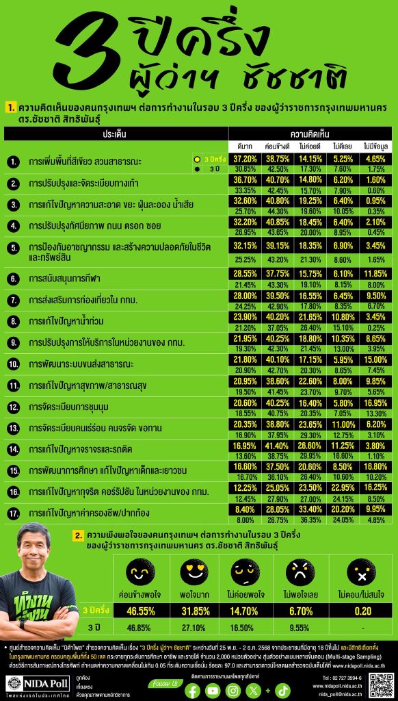 ศูนย์สำรวจความคิดเห็น “นิด้าโพล” สถาบันบัณฑิตพัฒนบริหารศาสตร์ เปิดเผยผลสำรวจเรื่อง “3 ปีครึ่ง ผู้ว่าฯ ชัชชาติ” โดยสอบถามความคิดเห็นของประชาชนชาวกรุงเทพมหานครที่มีสิทธิเลือกตั้ง จำนวน 2,000 หน่วยตัวอย่าง ระหว่างวันที่ 25 พฤศจิกายน – 2 ธันวาคม 2568 เพื่อประเมินผลการทำงานของผู้ว่าราชการกรุงเทพมหานคร ดร.ชัชชาติ สิทธิพันธุ์ ในช่วงโค้งสุดท้ายของวาระการดำรงตำแหน่ง
