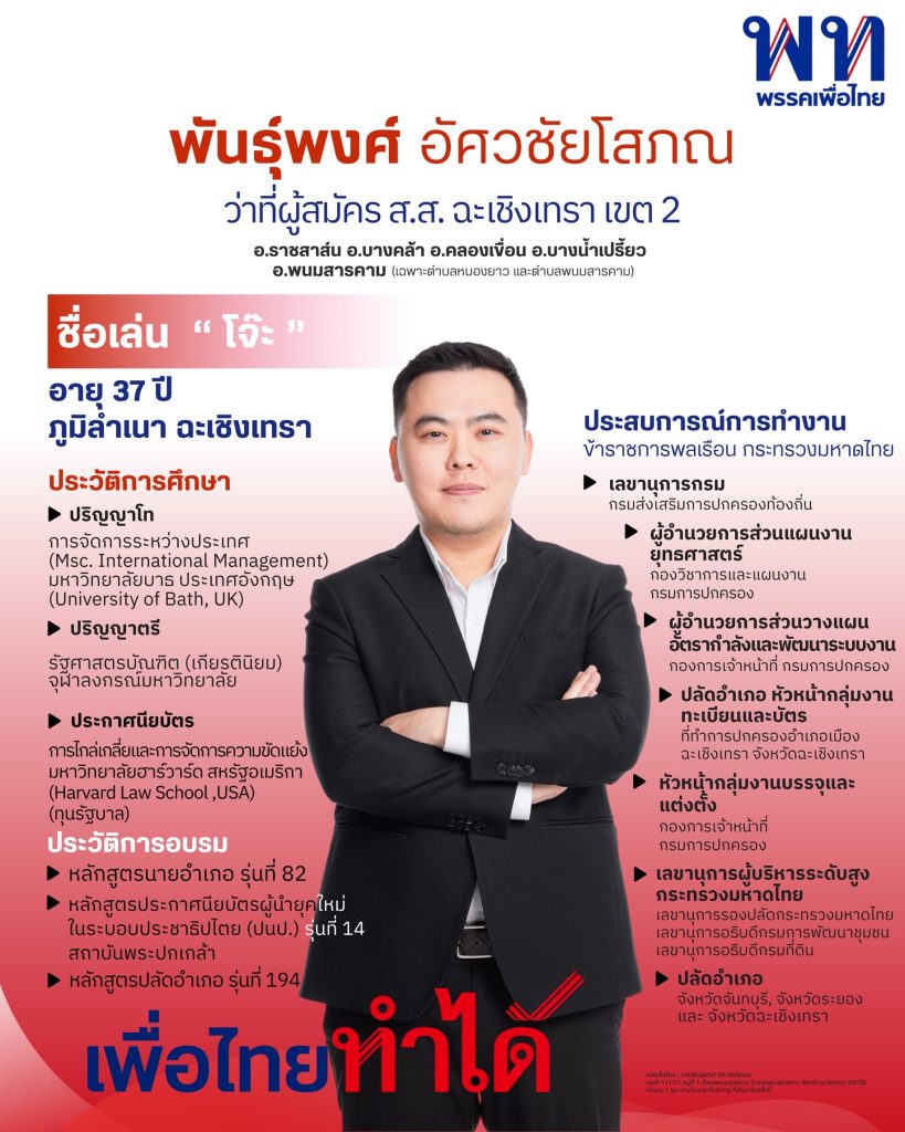 ผู้สื่อข่าวรายงานว่า สนามเลือกตั้ง ส.ส.ฉะเชิงเทรา “เฮียเน้า” สมชัย อัศวชัยโสภณ อดีตส.ส. พรรคเพื่อไทย ส่งลูกชายคนเล็ก “โจ๊ะ” พันธุ์พงศ์ อัศวชัยโสภณ อดีตเลขานุการกรม กรมส่งเสริมการปกครองท้องถิ่น กระทรวงมหาดไทย และ อดีตปลัดอำเภอหลายจังหวัด ลงสมัครรับเลือกตั้ง ส.ส.เขต 2 จ.ฉะเชิงเทรา พรรคเพื่อไทย
