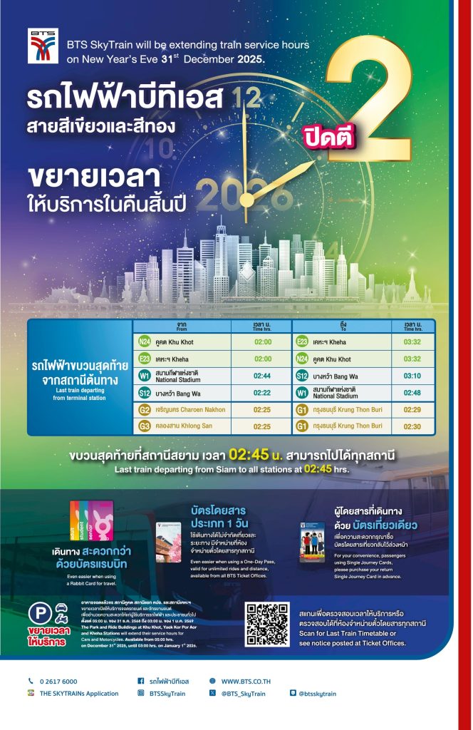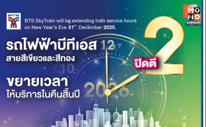 นายสุรพงษ์ เลาหะอัญญา กรรมการผู้อำนวยการใหญ่ บริษัท ระบบขนส่งมวลชนกรุงเทพ จำกัด (มหาชน) ผู้ให้บริการรถไฟฟ้าบีทีเอส กล่าวว่า เนื่องในโอกาสเทศกาลส่งท้ายปีเก่าต้อนรับปีใหม่ 2569 บริษัทฯ ร่วมกับกรุงเทพมหานคร และบริษัท กรุงเทพธนาคม จำกัด ขยายเวลาให้บริการเดินรถไฟฟ้าบีทีเอสทุกสถานี ทั้งสายสุขุมวิท และสายสีลม รวมถึงรถไฟฟ้าสายสีทอง ในคืนวันพุธ ที่ 31 ธันวาคม 2568 ถึงเวลา 02.00 น. ของวันพฤหัสบดี ที่ 1 มกราคม 2569