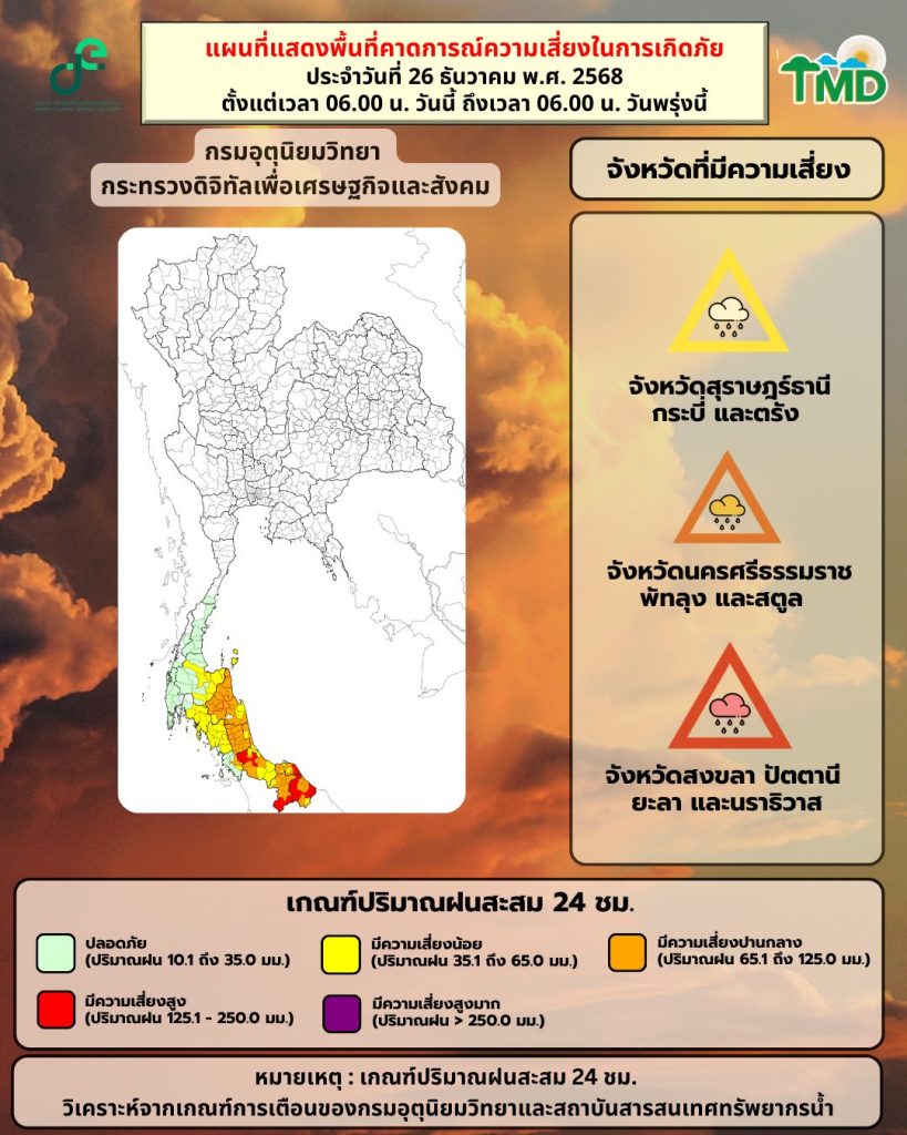 มรสุมตะวันออกเฉียงเหนือที่พัดปกคลุมอ่าวไทย ภาคใต้ และทะเลอันดามันมีกำลังแรงขึ้น ส่งผลให้ภาคใต้ตอนล่างมีฝนเพิ่มขึ้นและมีฝนตกหนักถึงหนักมากบางแห่ง โดยเฉพาะบริเวณจังหวัดสุราษฏร์ธานี นครศรีธรรมราช พัทลุง สงขลา ปัตตานี ยะลา และนราธิวาส จึงขอให้ประชาชนในบริเวณดังกล่าวระวังอันตรายจากฝนตกหนักถึงหนักมากและฝนที่ตกสะสม ซึ่งอาจทำให้เกิดน้ำท่วมฉับพลันและน้ำป่าไหลหลาก โดยเฉพาะพื้นที่ลาดเชิงเขาใกล้ทางน้ำไหลผ่านและพื้นที่ลุ่ม