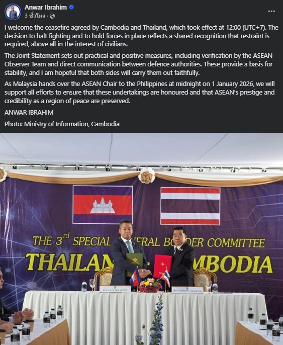 วันที่ 27 ธันวาคม 2568 เมื่อเวลา 14.19 น. นายอันวาร์ อิบราฮิม นายกรัฐมนตรีมาเลเซีย ได้โพสต์ข้อความยินดีที่กัมพูชาและไทยลงนามตกลงหยุดยิง โดยระบุว่า “ข้าพเจ้าขอแสดงความยินดีต่อข้อตกลงหยุดยิงระหว่างกัมพูชาและไทย ซึ่งมีผลบังคับใช้เมื่อเวลา 12:00 น. (UTC+7) การตัดสินใจยุติการสู้รบและตรึงกำลังทหารไว้ในพื้นที่ สะท้อนถึงการตระหนักรู้ร่วมกันว่าความยับยั้งชั่งใจเป็นสิ่งที่จำเป็นอย่างยิ่ง โดยเฉพาะเพื่อประโยชน์ของพลเรือนเป็นสำคัญ