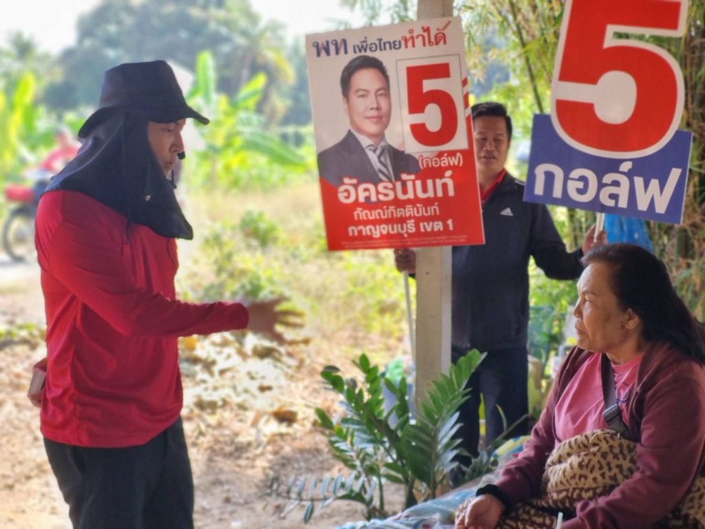 นายอัครนันท์ กัณณ์กิตตินันท์ ผู้สมัคร สส.กาญจนบุรี เขต 1 เบอร์ 5 พรรคเพื่อไทย ตลอดทั้งวันลงพื้นที่หาเสียง ที่ตำบลหนองหญ้า อำเภอเมือง กาญจนบุรี นั่งมอเตอร์ไซต์พ่วงข้าง เดินเท้าเคาะประตูบ้าน พบพี่น้องประชาชน พร้อมกับชูนโยบายของพรรค เช่นการประกันกำไรสินค้าเกษตร 30% เกษตรกรต้องไม่แบกรับความผันผวนของราคาสินค้าเกษตร หวยเกษียน บ้านเพื่อคนไทย ค่าไฟไม่เกิน 3.70 บาท/หน่วย และแก้ปัญหาสแกมเมอร์