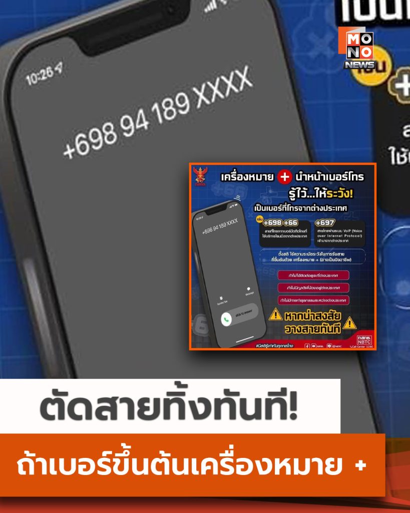 กสทช. จึงขอแจ้งเตือนให้ประชาชนเพิ่มความระมัดระวัง โดยเฉพาะการรับสายจากหมายเลขที่มีเครื่องหมาย “+” นำหน้า อาทิ +697, +698 หรือแม้แต่ +66 ซึ่งอาจถูกปลอมแปลงได้ หากไม่มีเครือญาติหรือธุระจำเป็นต้องติดต่อกับต่างประเทศ ขอให้ตัดสายทิ้งทันทีเพื่อความปลอดภัย และไม่ควรให้ข้อมูลส่วนตัวหรือทำธุรกรรมใด ๆ ผ่านโทรศัพท์