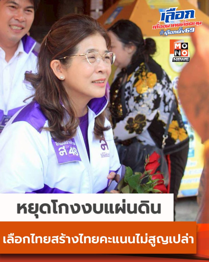 พร้อมกันนี้ยังชูประสบการณ์ทำงานทางการเมืองกว่า 30 ปี เคยดำรงตำแหน่งรัฐมนตรีถึง 4 กระทรวง บริหารงบประมาณรวมกว่าหนึ่งล้านล้านบาทโดยไม่เคยมีประวัติด่างพร้อย พร้อมยกผลงานสำคัญ ทั้งโครงการ 30 บาทรักษาทุกโรค การรับมือวิกฤตซาร์ส ไข้หวัดนก และเหตุการณ์สึนามิ เป็นหลักฐานยืนยันศักยภาพ พร้อมย้ำว่าพรรคไทยสร้างไทยเป็นพื้นที่ของคนทำงานสุจริต ไม่มีนายทุนครอบงำ และพร้อมเปลี่ยนทุกคะแนนเสียงให้เป็นพลังหยุดโกงเพื่อประเทศ