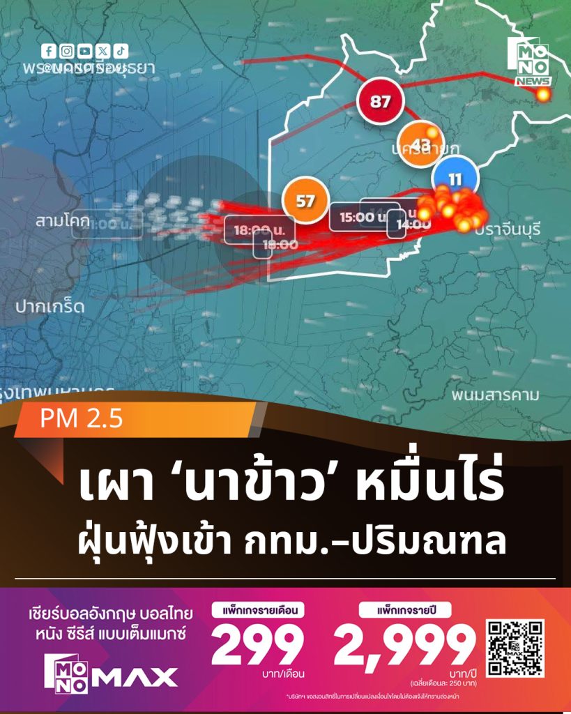 สภาลมหายใจกรุงเทพฯ ออกแถลงการณ์กังวลการเผาพื้นที่เกษตร จ.นครนายก กว่า 13,000 ไร่ ชี้ควันเคลื่อนสู่กรุงเทพฯ–ปริมณฑล กระทบสุขภาพประชาชนจำนวนมาก