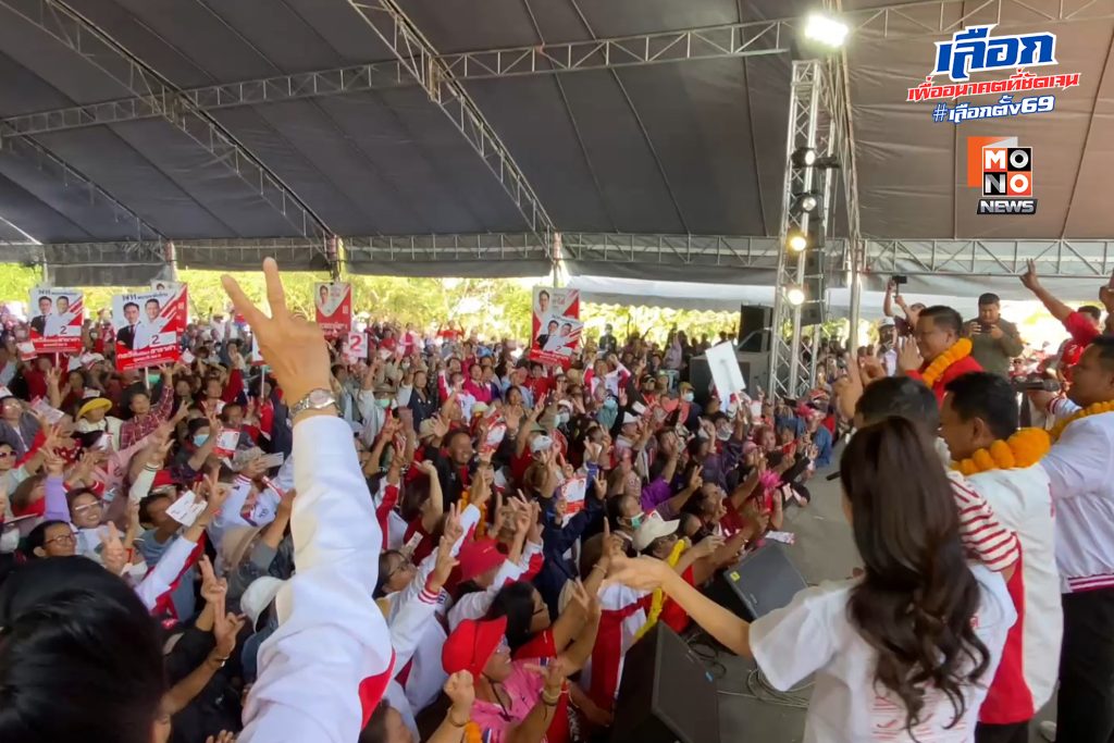 นายจุลพันธ์ อมรวิวัฒน์ หัวหน้าพรรคเพื่อไทย กล่าวบนเวทีว่า มาอุดรอบอุ่นทุกครั้ง เราจะเดินหน้าเพื่อนำประเทศไทยไปสู่ความเจริญ จะนำประเทศออกจากความขัดแย้ง นำประเทศไปสู่การพัฒนา พี่น้องจำนโยบาย 30 บาทรักษาทุกโรค กองทุนหมู่บ้าน โอท็อป วันนี้เพื่อไทยเรามาพร้อมนโยบายที่จะเป็นประโยชน์กับทุกท่าน ทั้งปลดหนี้ให้ประชาชน การแก้ไขปัญหาให้พี่น้องเกษตรกร พักหนี้ 3 ปี วงเงิน 5 แสนบาท เราจะดูแลเรื่องราคาสินค้า เป้าหมายคือราคาข้าวหอมมะลิ 15,000 บาท ข้าวขาว 10,000 บาท สินค้าเกษตรมีราคาให้ทุกตัว