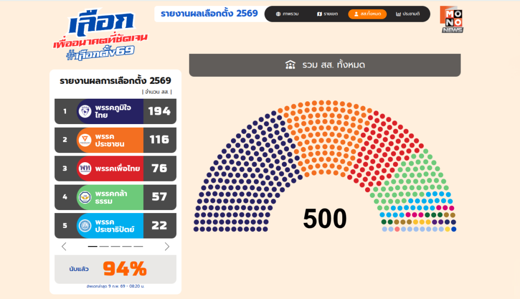 เช้าวันนี้ (9 ก.พ.) สำนักงานคณะกรรมการการเลือกตั้ง (กกต.) ได้เผยผลการนับคะแนนเลือกตั้งสมาชิกสภาผู้แทนราษฎรอย่างไม่เป็นทางการไปแล้วกว่า 93% โดยภาพรวมนับเป็นประเด็นครั้งสำคัญเมื่อ พรรคภูมิใจไทย สามารถกวาดที่นั่ง สส. เขตทั่วประเทศได้มากที่สุด พร้อมเป็นแกนนำจัดตั้งรัฐบาลชุดใหม่ ในขณะที่ พรรคประชาชน สร้างปรากฏการณ์ “ส้มทั้งเมือง” ยึดพื้นที่กรุงเทพฯ แบบเบ็ดเสร็จ