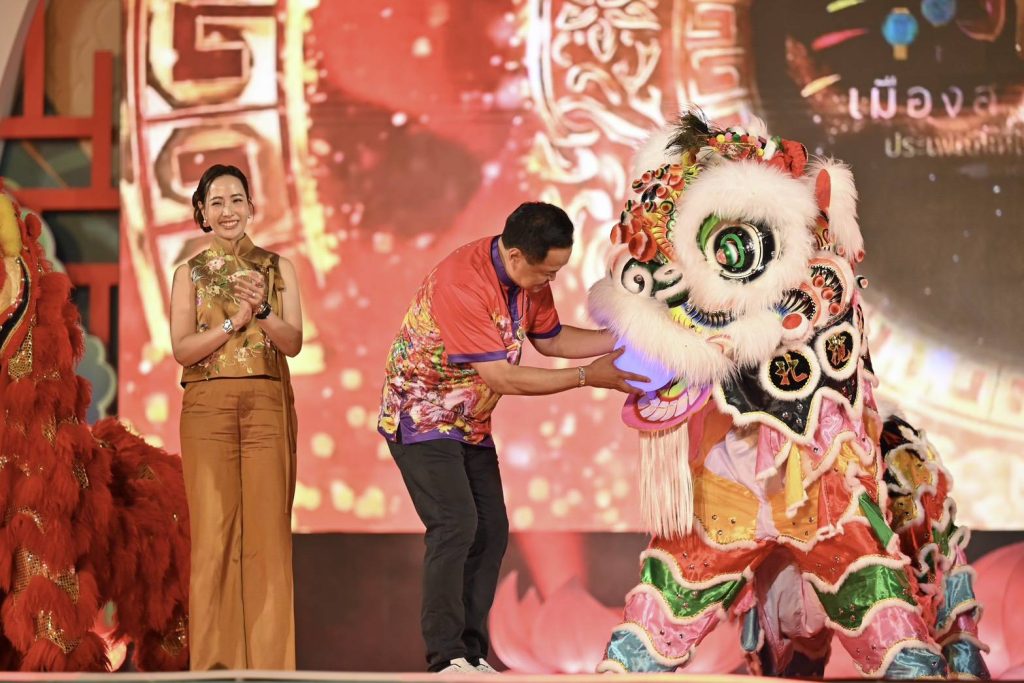 นายกรัฐมนนตรียังได้กล่าวอวยพร สวัสดีปีใหม่เป็นภาษาจีน ซินเจียยู่อี่ ซินนี้ฮวดใช้ จากนั้นเจ้าหน้าที่นำลูกแก้ว มาให้นายกรัฐมนตรีเพื่อที่จะนำไปป้อนเข้าปากสิงโต เพื่อเปิดพิธีทางการอย่างยิ่งใหญ่ โดยนายกรัฐมนตรีชี้เลือกลูกแก้วสีน้ำเงิน แทนสีแดง