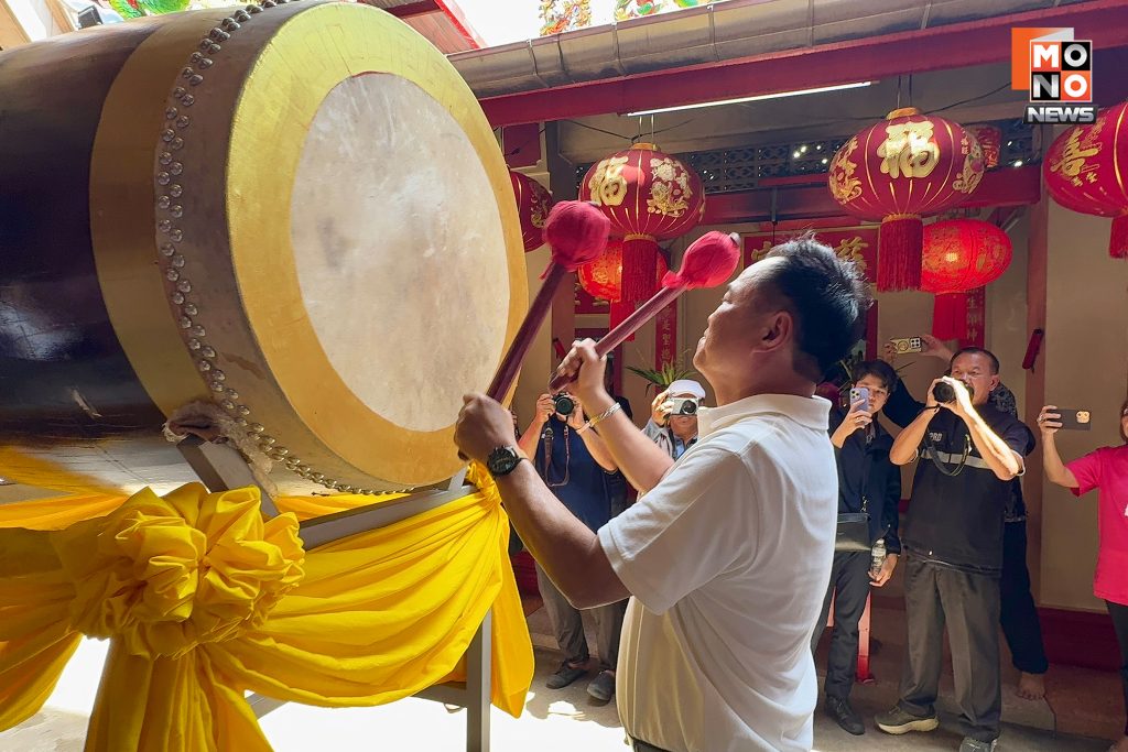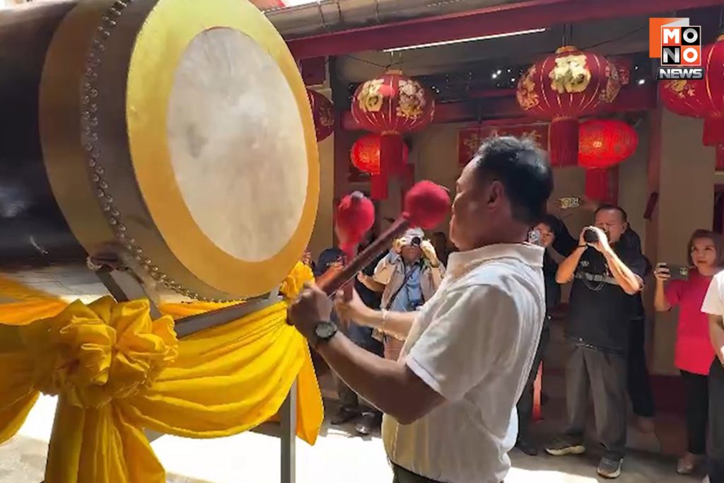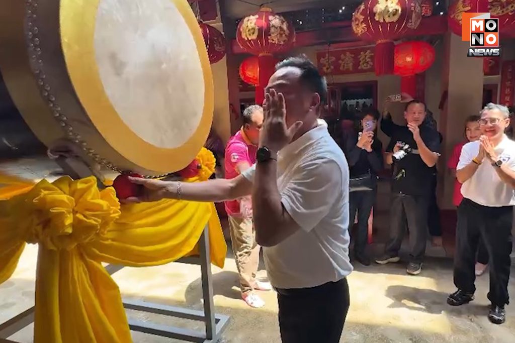 ต่อมาได้แวะศาลเจ้าต่างๆ เพื่อไหว้สิ่งศักดิ์สิทธิ์ ที่ศาลเจ้าต่ายเตเอี๋ย ศาลเจ้าเก่าแก่อายุร้อยกว่าปี ของพี่น้องชาวระนอง ในเขตพื้นที่อำเภอเมืองระนอง หลังกราบไหว้พระในศาลเจ้าเสร็จ ท่านก็ออกมาตีกลองประจำศาลเจ้า ท่ามกลางเสียงเชียร์ ท่านนายก ท่านนายก ซึ่งช่วงท้ายได้ตีพลาดถูกไม้กลองเด้งฟาดเข้าที่ใบหน้า จากนั้นคนต่อมา นายวราวุธ ศิลปอาชา ก็ลั่นกลองต่อ และมีเสียงเชียร์ ท่านรัฐมนตรี ท่านรัฐมนตรี ต่อเนื่องจนถึงคิวลั่นกลองของ นายคงกฤษ ฉัตรมาลีรัตน์ ว่าที่ส.ส.เขต1 ระนอง ก็ยังมีเสียงเชียร์ ท่านรัฐมนตรี ท่านรัฐมนตรี อยู่ต่อเนื่อง หลังจากนั้นก็ขึ้นรถแห่ต่อโดยขบวนรถแห่ก็ไปจบ ที่สุสานท่านเจ้าเมือง พระยาดำรงสุจริตมิศรภักดี หรือท่านคอซูเจียง ต้นตระกูล ณ ระนอง ที่ลูกหลานรับใช้เป็นข้าราชการต่อเนื่อง ตั้งแต่ สมัยรัชกาลที่ 4 จนถึง รัชกาลที่ 7