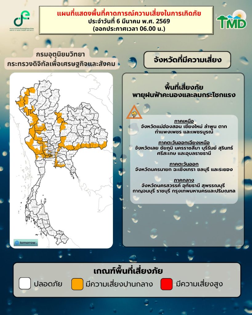 - มีพายุฝนฟ้าคะนอง ร้อยละ 20 ของพื้นที่ กับมีลมกระโชกแรงบางแห่ง