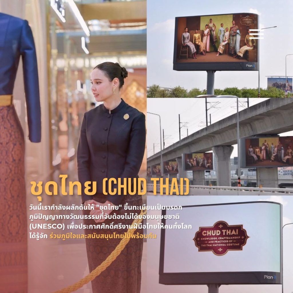 ล่าสุดได้รับการร่วมมือกับภาคเอกชน อย่าง Plan B (แพลน บี มีเดีย) ที่ร่วมเป็นส่วนหนึ่ง ในหน้าประวัติศาสตร์ เผยแพร่ “ชุดไทย” สู่สาธารณะ ผ่านป้ายโฆษณาบิลบอร์ด ทั่วกรุงเทพมหานคร ตามแนวทางที่กรมส่งเสริมวัฒนธรรม กระทรวงวัฒนธรรม จะผลักดัน “ชุดไทย” สู่การขึ้นทะเบียนเป็นมรดกภูมิปัญญาทางวัฒนธรรมที่จับต้องไม่ได้ของมนุษยชาติ (UNESCO)