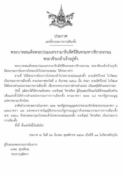พระบาทสมเด็จพระปรเมนทรรามาธิบดีศรีสินทรมหาวชิราลงกรณ พระวชิรเกล้าเจ้าอยู่หัว มีพระบรมราชโองการโปรดเกล้าโปรดกระหม่อม ให้ประกาศว่า ตามที่ได้มีพระบรมราชโองการโปรดเกล้าโปรดกระหม่อมแต่งตั้ง นายเลิศวิโรจน์ โกวัฒนะ เป็นกรรมการการเลือกตั้ง ตามประกาศลงวันที่ 4 ธันวาคม 2561 นั้น ต่อมา นายเลิศวิโรจน์ โกวัฒนะ ได้พ้นจากตำแหน่งกรรมการการเลือกตั้ง เนื่องจากครบวาระการดำรงตำแหน่ง เป็นเหตุให้ตำแหน่งว่างลง