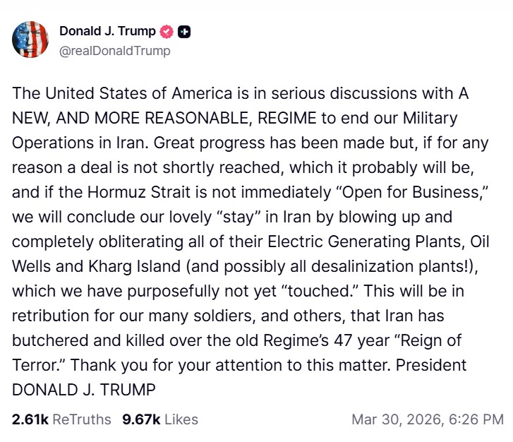 วันที่ 30 มีนาคม 2569 ประธานาธิบดี โดนัลด์ เจ. ทรัมป์ แห่งสหรัฐอเมริกา ออกโรงขู่ขั้นเด็ดขาด ประกาศกร้าวผ่าน “Truth Social” พร้อมถล่มโครงสร้างพื้นฐานสำคัญของอิหร่านให้ราบเป็นหน้ากลอง หากการเจรจาสันติภาพกับรัฐบาลชุดใหม่ล้มเหลว หรือไม่ยอมเปิดใช้เส้นทางเดินเรือในช่องแคบฮอร์มุซ (Hormuz Strait) ในทันที