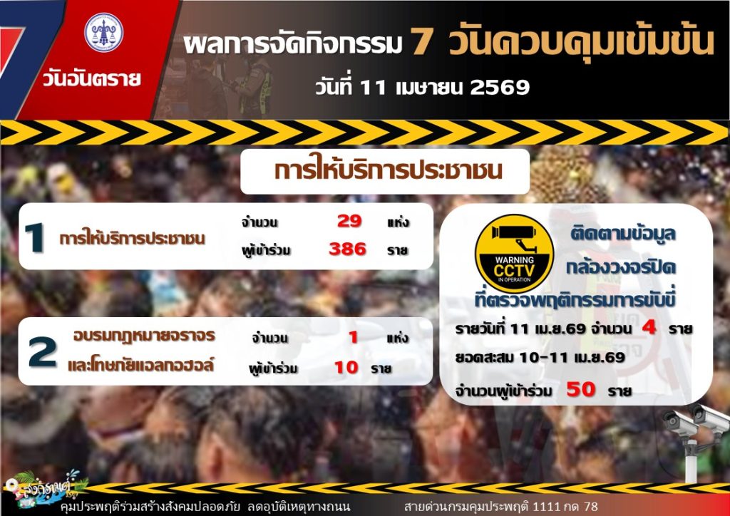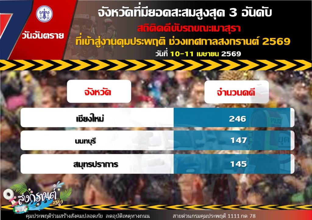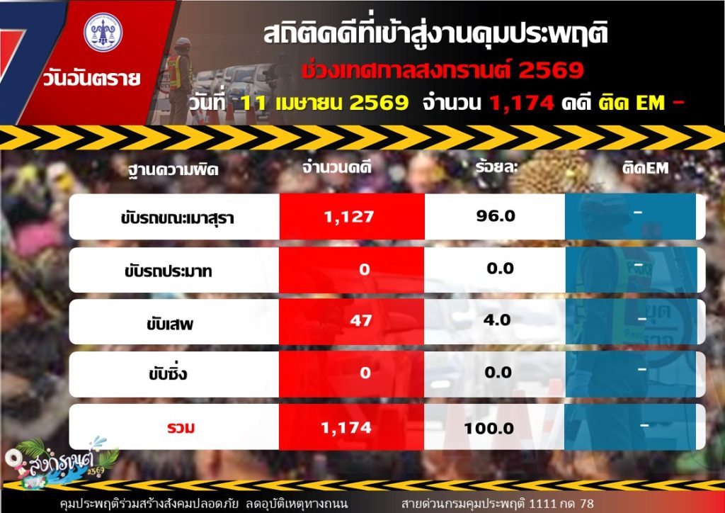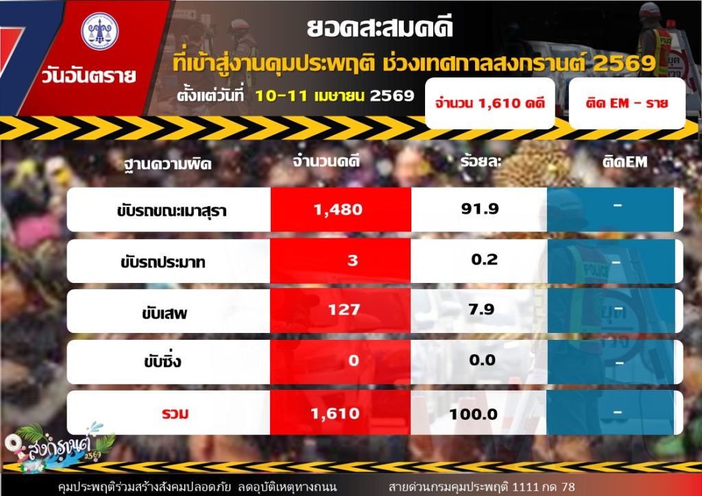 ขณะเดียวกันสถิติคดีสะสมช่วง 2 วันแรก (10 – 11 เมษายน 2569) มีจำนวนรวมทั้งสิ้น 1,610 คดี แบ่งเป็น คดีขับรถขณะเมาสุรา 1,480 คดี คิดเป็นร้อยละ 91.9 คดีขับเสพ 127 คดี คิดเป็นร้อยละ 7.9 และคดีขับรถประมาท 3 คดี คิดเป็นร้อยละ 0.2
