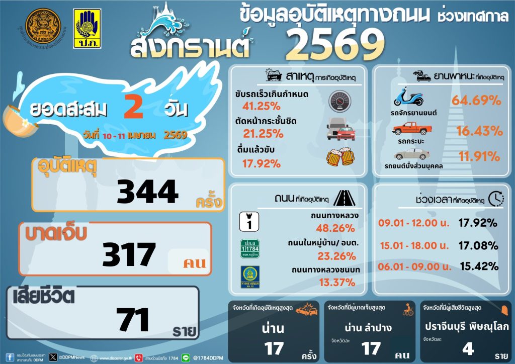 สรุปอุบัติเหตุทางถนนสะสมในช่วง 2 วันของการรณรงค์ (10 – 11 เม.ย. 69) เกิดอุบัติเหตุรวม 344 ครั้ง ผู้บาดเจ็บ รวม 317 คน ผู้เสียชีวิต รวม 71 ราย จังหวัดที่เกิดอุบัติเหตุสะสมสูงสุดได้แก่ น่าน (17 ครั้ง) จังหวัดที่มีผู้บาดเจ็บสะสมสูงสุด ได้แก่ น่าน และลำปาง (จังหวัดละ 17 คน) จังหวัดที่มีผู้เสียชีวิตสะสมสูงสุด ได้แก่ ปราจีนบุรี และพิษณุโลก (จังหวัดละ 4 ราย) จังหวัดที่ไม่มีผู้เสียชีวิต (ตายเป็นศูนย์) มี 39 จังหวัด