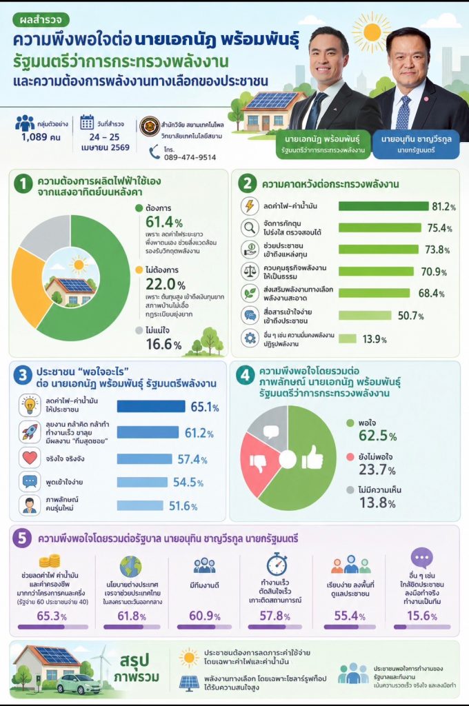 ด้านดร.ธนเสฏฐ์ อัคคัญญ์ภูดิส หัวหน้าสำนักวิจัยประจำสำนักวิจัยสยามเทคโนโพล วิทยาลัยเทคโนโลยีสยาม เปิดเผยผลสำรวจเรื่อง ความพึงพอใจต่อ นายเอกนัฏ พร้อมพันธุ์ รมว.พลังงานและความต้องการพลังงานทางเลือกของประชาชน ทำโครงการนี้ระหว่างวันที่ 24 – 25 เมษายน พ.ศ. 2569 จำนวนผู้ตอบแบบสอบถามทั้งสิ้น 1,089 หน่วยตัวอย่าง พบว่า ความคาดหวังต่อกระทรวงพลังงาน ร้อยละ 81.2 คาดหวังให้ลดค่าไฟ–ค่าน้ำมัน และร้อยละ 75.4 จัดการกักตุน โปร่งใส ตรวจสอบได้