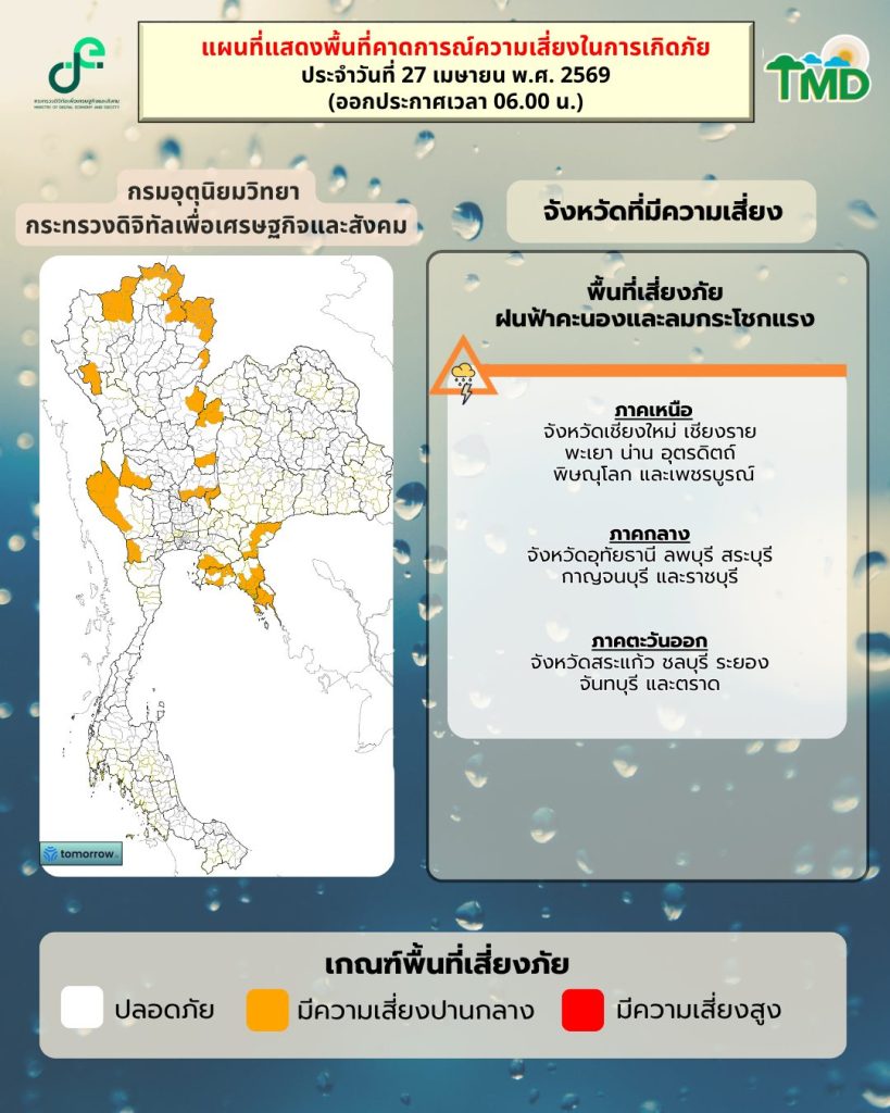 อนึ่ง ในช่วงวันที่ 28 เม.ย. – 1 พ.ค. 69 บริเวณความกดอากาศสูงหรือมวลอากาศเย็นจากประเทศจีนอีกระลอกหนึ่งจะแผ่ลงมาปกคลุมทะเลจีนใต้และภาคตะวันออกเฉียงเหนือ ในขณะที่ประเทศไทยตอนบนมีอากาศร้อน ลักษณะเช่นนี้ทำให้ประเทศไทยตอนบนจะมีพายุฤดูร้อนเกิดขึ้น โดยมีลักษณะของพายุฝนฟ้าคะนอง ลมกระโชกแรง ลูกเห็บตก และอาจมีฟ้าผ่าเกิดขึ้นได้ในบางพื้นที่ ทั้งนี้ จะเริ่มส่งผลกระทบต่อภาคตะวันออกเฉียงเหนือ ภาคเหนือ และภาคตะวันออกก่อน จากนั้นภาคกลาง รวมถึงกรุงเทพมหานครและปริมณฑล จะได้รับผลกระทบในระยะถัดไป
