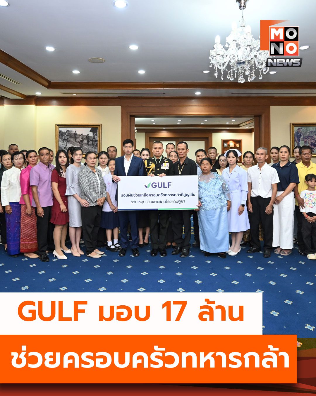 GULF มอบ 17 ล้านช่วยครอบครัวทหารกล้า GULF มอบเงิน 17 ล้านบาทจากกองทุน 100 ล้าน ดูแลครอบครัวทหารกล้า 17 ครอบครัว พร้อมเดินหน้าสนับสนุนภารกิจความมั่นคงชายแดนไทย–กัมพูชา บริษัท กัล .. 06 ก.ย. 2025 | ข่าวทั่วไป