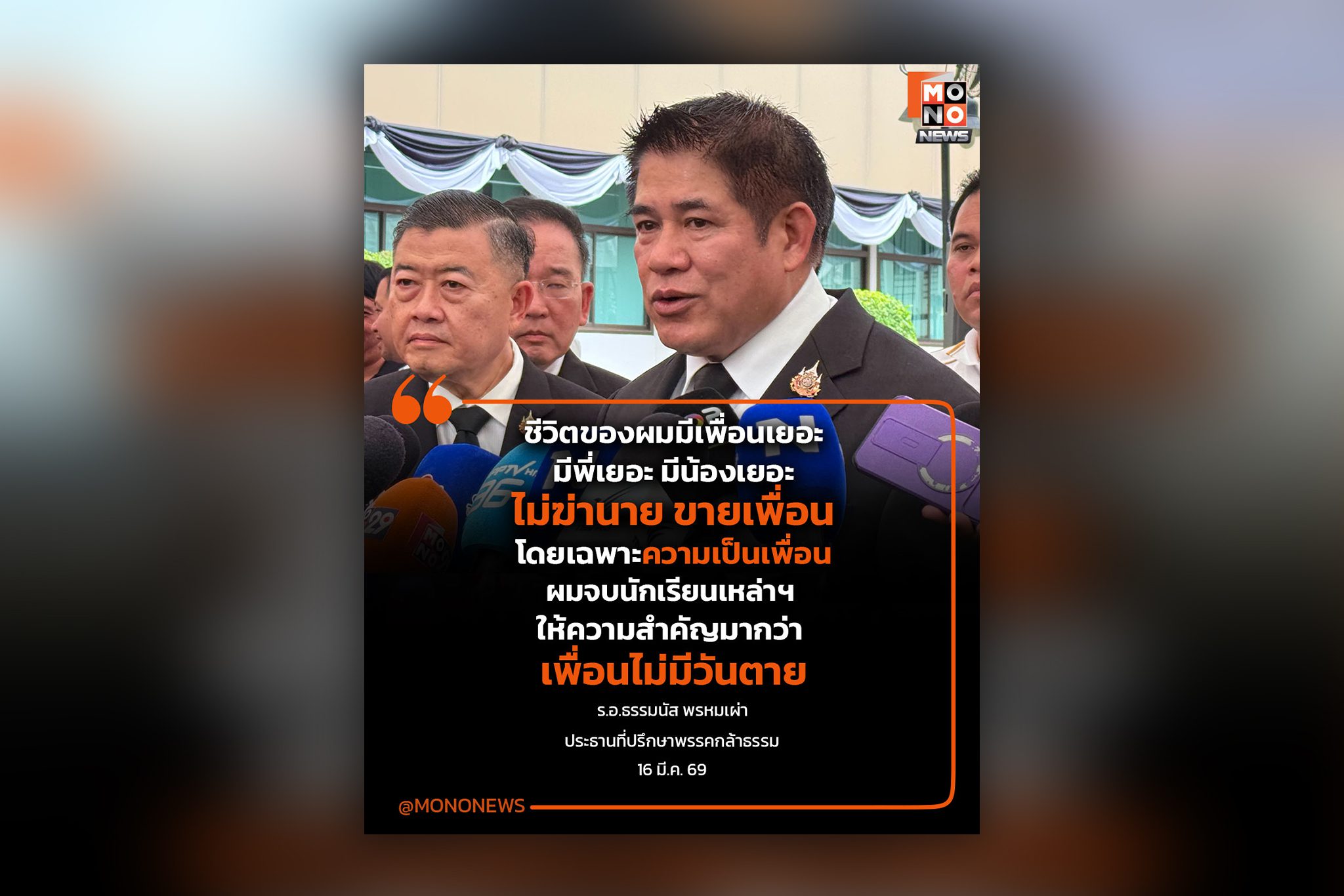 “ธรรมนัส” รับยังไม่ได้คุย “อนุทิน” ลั่นเป็นคนไม่ฆ่านาย ไม่ขายเพื่อน ร.อ.ธรรมนัส พรหมเผ่า ประธานที่ปรึกษาพรรคกล้าธรรม ให้สัมภาษณ์กรณี นายอนุทิน ชาญวีรกูล ในฐานะหัวหน้าพรรคภูมิใจไทย ระบุว่า “ความเป็นเพื่อ .. 16 มี.ค. 2026 | ข่าวการเมือง