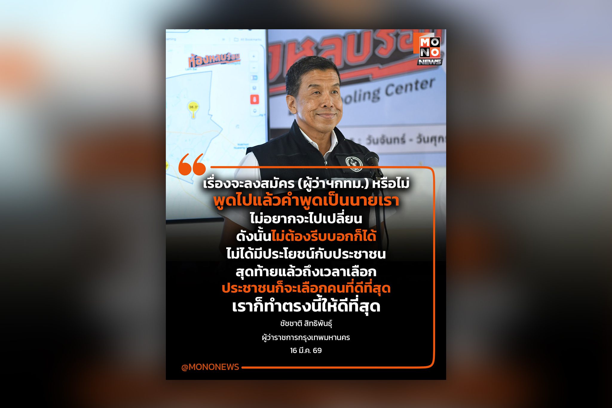 “ชัชชาติ” ขอ 2 เดือนตอบชัด ลงสนามผู้ว่า ฯ กทม.หรือไม่ หวั่นคำพูดเป็นนาย เปลี่ยนใจไม่ดี นายชัชชาติ สิทธิพันธุ์ ผู้ว่าราชการกรุงเทพมหานคร ให้สัมภาษณ์ถึงความเป็นไปได้ในการลงสนามเลือกตั้งผู้ว่าฯ กทม. ที่จะมีขึ้นในเดือนกรกฎาคมนี้ โด .. 16 มี.ค. 2026 | ข่าวการเมือง