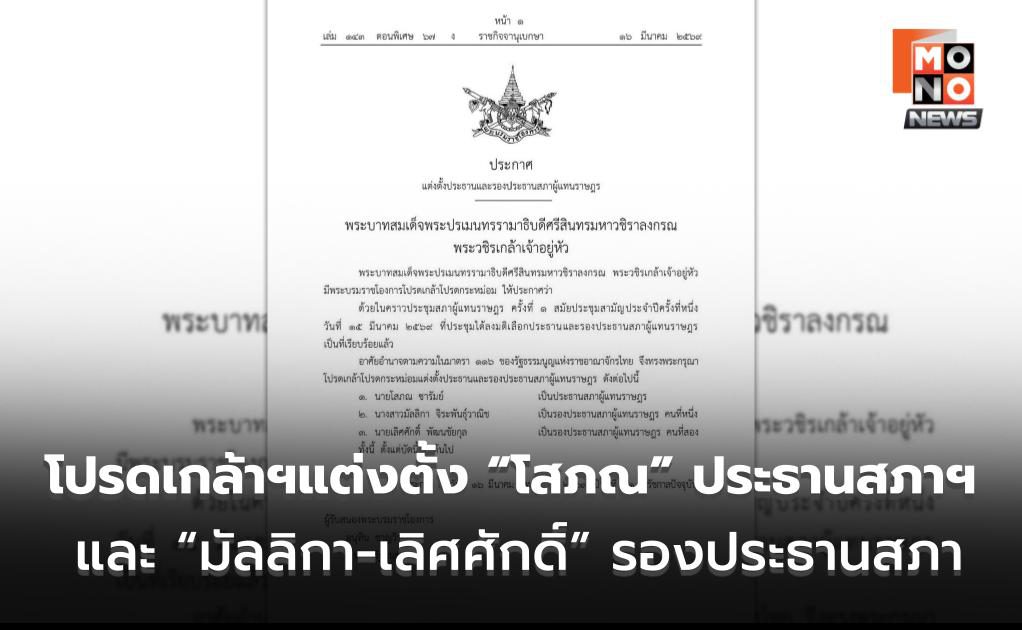 โปรดเกล้าฯแต่งตั้ง “โสภณ” ประธานสภาฯ และ “มัลลิกา-เลิศศักดิ์” รองประธานสภา วันที่ 16 มีนาคม 2569 เว็บไซต์ราชกิจจานุเบกษา เผยแพร่ ประกาศพระบรมราชโองการโปรดเกล้าโปรดกระหม่อมแต่งตั้งประธานและรองประธานสภาผู้แทนราษฎร พระ .. 16 มี.ค. 2026 | ข่าวการเมือง