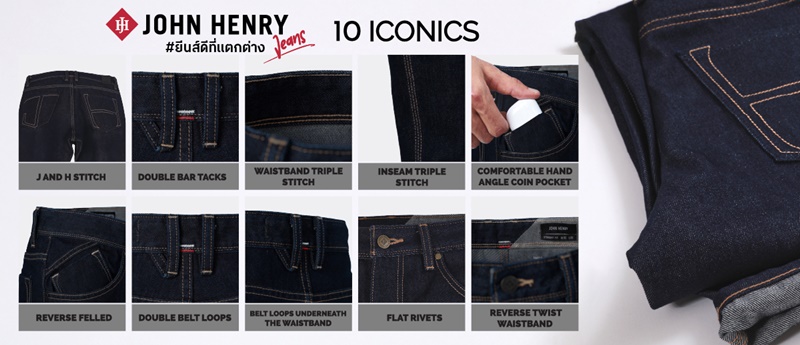 JOHN HENRY JEANS เปิดตัวด้วยคอลเลคชั่นแรกที่มาพร้อมกับการเย็บตะเข็บคู่บริเวณจุดสำคัญเสริมความแข็งแรง ที่บริเวณตะเข็บขาด้านในเย็บแบบสามชั้นยากต่อการฉีกขาดในบริเวณเป้ากางเกง ห่วงเข็มขัดเย็บใต้ขอบเอวเพิ่มความแน่นหนาป้องกันการหลุดขาดเมื่อใช้งาน เทคนิคการเย็บตะเข็บย้อนกลับช่วยซ่อนขอบผ้า เพิ่มความเรียบเนียน สวยงาม และลดการเสียดสี โลหะทั้งหมดไม่ว่าจะ หมุด กระดุม เรียบแบน เพื่อไม่ให้เกะกะหรือเกี่ยวพันกับสิ่งอื่นๆ มาพร้อมดีไซน์อันโดดเด่นที่บริเวณกระเป๋าหลังด้านซ้ายเดินตะเย็บเป็นอักษรตัว “J” สื่อถึง Journey หรือการเดินทาง ส่วนกระเป๋าด้านขวาเดินตะเข็บเป็นอักษรตัว “H” สื่อถึง Home หรือ จุดหมาย ทำให้ผู้สวมใส่รู้สึกว่าไม่ว่าพวกเขาจะเดินทางไปที่ไหน กางเกงยีนส์นี้จะเป็นทั้งเพื่อนร่วมทางและที่พักใจ ส่วนขอบเอวแบบบิดกลับเพิ่มดีไซน์ให้โดดเด่นเป็นเอกลักษณ์ กระเป๋ากางเกงทั้งด้านหน้าและด้านหลังออกแบบความลึกมาเพื่อรองรับกับองศาของมือสะดวกยิ่งขึ้น ห่วงเข็มขัดคู่ที่บริเวณกลางขอบเอวด้านหลังช่วยพยุงไม่ให้กางเกงหลุดสะโพก หนุ่มๆ จึงสวมใส่ได้อย่างมั่นใจ