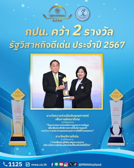 🏆รางวัลความร่วมมือเชิงยุทธศาสตร์เพื่อการพัฒนาดีเด่น จาก “โครงการความร่วมมือการบูรณาการข้อมูลเพื่อเพิ่มประสิทธิภาพการให้บริการลูกค้าระหว่างการประปานครหลวง (กปน.) และการไฟฟ้านครหลวง (กฟน.)” ซึ่งเป็นการบูรณาการ ด้านความร่วมมือด้านเทคโนโลยีระหว่าง กปน. และ กฟน. โดยการแบ่งปันข้อมูล องค์ความรู้ด้านเทคโนโลยีและกฎหมายที่เกี่ยวข้องต่าง ๆ ร่วมกัน เพื่อยกระดับการให้บริการด้านไฟฟ้า-ประปาที่ครบวงจร และอำนวยความสะดวกให้กับผู้ใช้บริการในพื้นที่รับผิดชอบ ได้แก่ กรุงเทพมหานคร นนทบุรี และสมุทรปราการ เพื่อเพิ่มศักยภาพในการให้บริการพร้อมยกระดับความพึงพอใจในการให้บริการ และสร้างประโยชน์สูงสุดให้กับประชาชน สังคม และประเทศชาติ โดยโครงการความร่วมมือฯ ตอบสนองต่อนโยบายภาครัฐ นโยบายกระทรวง เจ้าสังกัด และนโยบายด้านเศรษฐกิจและสังคมต่าง ๆ ทำให้ทั้ง 2 หน่วยงาน สามารถใช้ทรัพยากรที่มีอยู่ เพื่อสร้างผลประโยชน์ให้กับประชาชนได้ในวงกว้าง กล่าวคือ ไม่มีการใช้งบประมาณใด ๆ ในการดำเนินการความร่วมมือนี้ แต่สามารถสร้างประโยชน์และตอบสนองความต้องการให้กับผู้ใช้บริการในเขตพื้นที่บริการกว่า 4 ล้านครัวเรือนได้อย่างทั่วถึงและมีประสิทธิภาพมากขึ้น