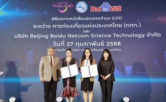 วันที่ 27 กุมภาพันธ์ 2568 ณ ห้องโถงธนะรัตช์ ชั้น 1 อาคาร ททท. นางสาวฐาปนีย์ เกียรติไพบูลย์ ผู้ว่าการการท่องเที่ยวแห่งประเทศไทย (ททท.) เป็นประธานในพิธีลงนามหนังสือแสดงเจตจำนง (LOI : Letter of Intent) ระหว่าง ททท. กับ บริษัท Beijing Baidu Netcom Science Technology จำกัด บริษัทเทคโนโลยียักษ์ใหญ่ของจีน เพื่อส่งเสริมการท่องเที่ยวไทยผ่านแพลตฟอร์มดิจิทัลและเทคโนโลยี AI ของ Baidu ตลอดระยะเวลา 1 ปี ความร่วมมือนี้มุ่งเน้นการตลาดและประชาสัมพันธ์เชิงรุก โดยใช้เครือข่ายของ Baidu ในการเผยแพร่ข้อมูลท่องเที่ยว ประชาสัมพันธ์กิจกรรมส่งเสริมการขาย ศึกษาพฤติกรรมผู้ใช้งาน เพื่อเพิ่มการรับรู้และสร้างแรงจูงใจในการเดินทาง ตลอดจนเสริมสร้างภาพลักษณ์การท่องเที่ยวไทยให้แข็งแกร่ง ฟื้นความเชื่อมั่น และดึงดูดนักท่องเที่ยวจีนศักยภาพสูงมายังประเทศไทยสูงสุด 8 ล้านคนในปี 2568