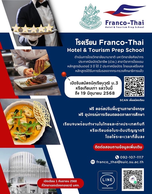 สำหรับผู้ที่สนใจ สามารถติดต่อสอบถามข้อมูลเพิ่มเติมได้ที่โรงเรียนเตรียมการโรงแรมและการท่องเที่ยวไทย-ฝรั่งเศส หรือติดตามข่าวสารได้จากช่องทางของมหาวิทยาลัยศิลปากร Facebook: Silpakorn University