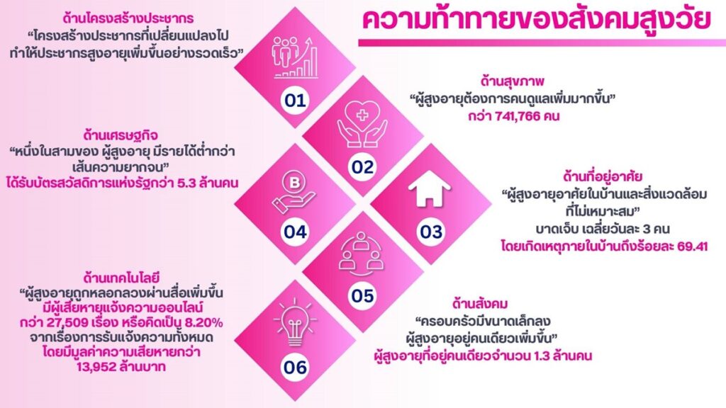 ประเทศไทยกำลังเผชิญความท้าทายที่สำคัญหลังเข้าสู่สังคมผู้สูงอายุ โดยสำนักงานสถิติแห่งชาติ ระบุว่า ปี 2567 ผู้สูงอายุคิดเป็น 20.70% ของประชากรทั้งหมดของประเทศ และคาดการณ์ว่าในปี 2576 จะมีสัดส่วนประชากรสูงอายุเกิน 30% ทำให้ไทยกลายเป็น “สังคมสูงอายุระดับสุดยอด หรือ Super Aged Society” ซึ่งหมายถึงสังคมที่มีประชากรอายุ 60 ปีขึ้นไปมากกว่า 28% หรือมีประชากรอายุ 65 ปีขึ้นไปมากกว่า 20% ของประชากรทั้งหมด ส่งผลให้ประเทศเผชิญความท้าทายด้านเศรษฐกิจสวัสดิการและสุขภาพที่เกิดจากการเสื่อมถอยที่มาพร้อมวัย