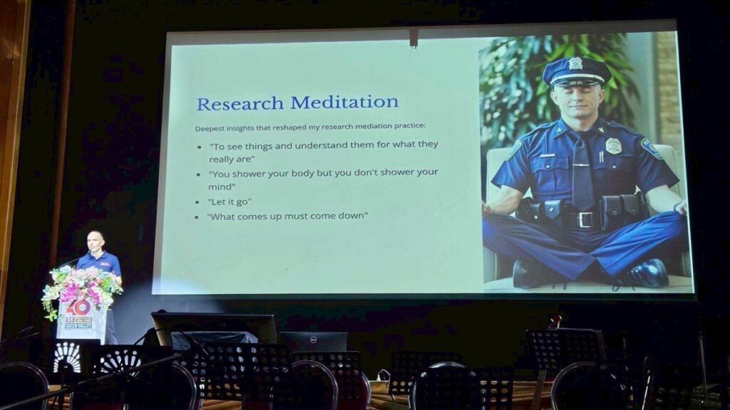 อีกหนึ่งช่วงเวลาที่น่าสนใจกับ P.O.P.P.A. กรมตำรวจนครนิวยอร์ก โดย นายตำรวจจิมมี่ เฟอร์ราซโซ (Jimmy Ferrazzo) และตำรวจฝ่ายสืบสวนหลุยส์ โลเปซ (Luis Lopez) ที่บินตรงจากสหรัฐอเมริกา มาบรรยายหัวข้อ “ความสามารถในการปรับตัวและสุขภาวะที่ดีในสายงานบังคับใช้กฎหมาย” (Resilience and Wellness within Law Enforcement) ตำรวจทั้งสองนาย เผยว่า การเป็นตำรวจ NYPD ไม่ใช่แค่อาชีพ แต่นั่นคือชีวิตประจำวันของตำรวจที่ต้องเผชิญกับอาชญากรรมมากมาย เราได้พบกับความเศร้าโศกของเหยื่ออาชญากรรม แต่ความรู้สึก ความเศร้าโศก ของตำรวจมักถูกมองข้ามไป ทั้งยังเผชิญกับความท้าทาย ที่ไม่อาจคาดเดาได้ ทำให้ตำรวจ เป็นอาชีพที่มีความเครียดสูง โดยพบว่าในแต่ละปี มีตำรวจฆ่าตัวตาย ถึง 184 ราย ซึ่งเป็นสัดส่วนตัวเลขที่สูงกว่าตำรวจที่เสียชีวิตในหน้าที่เสียอีก ทำให้ตระหนักว่า ตำรวจมีเสื้อเกราะกันกระสุน แต่ไม่มีอะไรช่วยปกป้องจิตใจเลย “กระทั่งเราได้พบกับ อาจารย์ฮาร์ตันโต คุณวัน เมื่อปี 2022 ในกิจกรรมการฝึกวิปัสสนา โดยฝึก Research Meditation เมื่อได้ฝึกฝน เห็นได้ชัดว่าสามารถช่วยให้ความวิตกกังวล และความทุกข์ลดลง ทำให้ชีวิตมีความสมดุล เข้าใจถึงหลักของธรรมชาติ และเมื่อนำไปช่วยองค์กรที่ช่วยเหลือตำรวจ Police Organization Providing Peer Assistance (P.O.P.P.A.) ผลคือ ทุกวันนี้เรามีชีวิตที่ดีขึ้น รู้สึกเกิดพลังบวก มีสติ เกิดปัญญา จากการฝึกปฏิบัติสมาธิ”