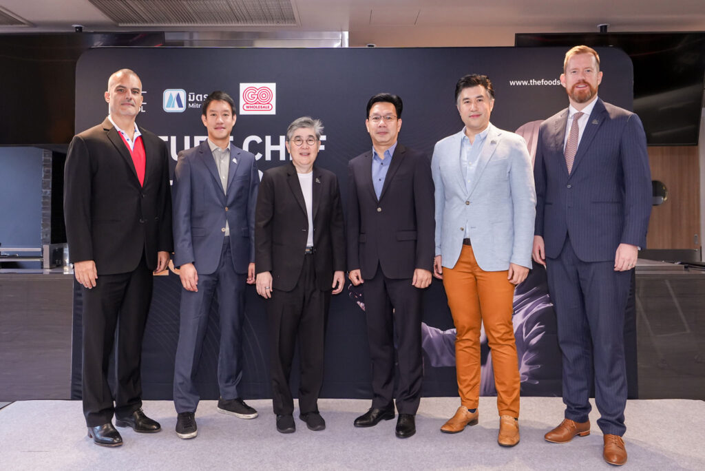 นายศิรเดช โทณวณิก กรรมการบริหาร บริษัท The Food School Bangkok พร้อมด้วย นายผรินทร์ อมาตยกุล รองกรรมการผู้จัดการใหญ่ กลุ่มงานการตลาด – มิตรผล และ นายริคาร์โด้ เบารอตโต้ ประธานเจ้าหน้าที่บริหาร ธุรกิจเซ็นทรัล ฟู้ด โฮลเซลล์ ประเทศไทย ร่วมแถลงข่าวโครงการ “Future Chef of the World 2025” เพื่อสร้างโอกาสให้ผู้ที่มีศักยภาพและความสามารถด้านอาหารได้พัฒนาตนเองสู่การเป็นเชฟมืออาชีพระดับสากล พร้อมมอบทุนเรียนทำอาหารมูลค่ากว่า 1.5 ล้านบาท ภายใต้แนวคิด Rethink Culinary Sustainability โดยมี นางสาวปริม จิตจรุงพร, นายกวิน ว่องกุศลกิจ ร่วมงานด้วย ณ The Food School Bangkok อาคาร E โครงการ BLOCK 28 จุฬาฯ ซอย 9