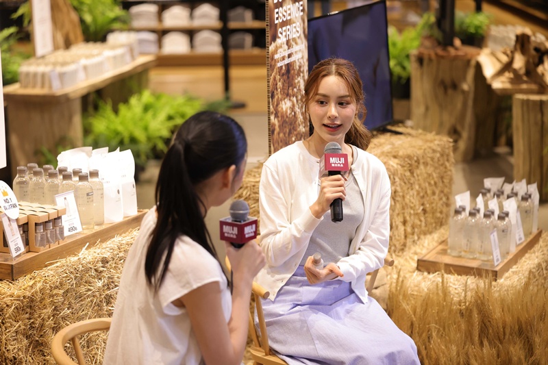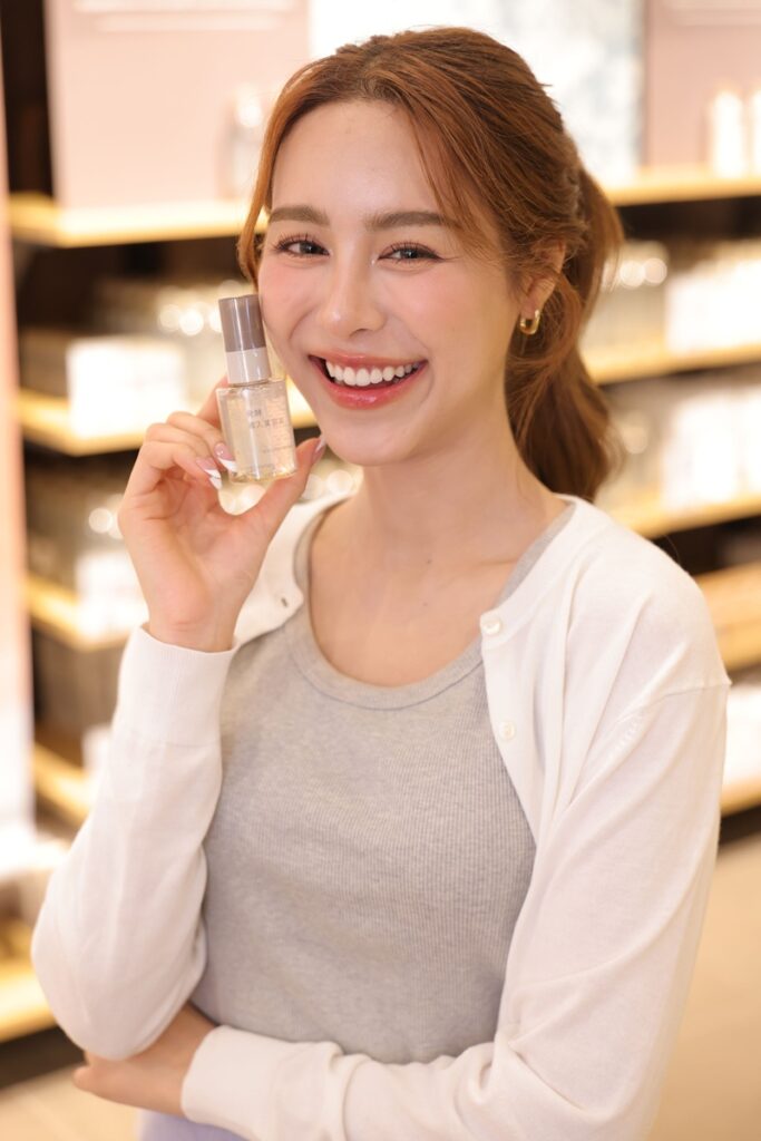 ด้านนักแสดงสาว พีพี-ปุญญ์ปรีดี คุ้มพร้อม รอดสวาสดิ์ มาร่วมเผยเคล็ดลับการดูแลผิวในชีวิตประจำวัน เพื่อให้ผิวสวยสุขภาพดีอย่างยั่งยืน และเผยถึงความประทับใจต่อผลิตภัณฑ์ของมูจิว่า “ปกติเราเป็นคนที่ใส่ใจเรื่องการดูแลผิวมากๆ เพราะด้วยอาชีพนักแสดงของเราที่ต้องแต่งหน้าทุกวัน เดินทางบ่อย เผชิญกับแสงไฟและแสงแดด เรื่องความชุ่มชื้นผิวจึงเป็นสิ่งที่ให้ความสำคัญมาก เพราะเป็นเหมือนพื้นฐานที่จะช่วยให้ผิวแข็งแรง พอได้ลองสกินแคร์ใหม่ของมูจิแล้วชอบมาก เพราะโดยส่วนตัวเป็นคนเลือกใช้ผลิตภัณฑ์ที่อ่อนโยนต่อผิวอยู่แล้ว และยิ่งรู้ว่าเป็นส่วนผสมจากธรรมชาติ 100% ก็ยิ่งรู้สึกสบายใจเวลาใช้ เนื้อสัมผัสของก็บางเบา ซึมไว ไม่เหนอะหนะ แล้วกลิ่นก็เป็นธรรมชาติแบบไม่ปรุงแต่งเลย ช่วยให้รู้สึกผ่อนคลาย สิ่งที่ชอบที่สุดคือความใส่ใจในรายละเอียดเล็กๆ น้อยๆ ของมูจิอย่างการเลี่ยงสารเคมีที่อาจก่อให้เกิดการระคายเคือง อย่างพาราเบน แอลกอฮอล์ หรือสีสังเคราะห์ ทำให้รู้สึกมั่นใจว่าใช้ได้ทุกวันโดยไม่ต้องกังวลเรื่องผิวแพ้ ที่ชอบมากๆ อีกอย่างคือบูสเตอร์เซรั่ม พอใช้หลังล้างหน้าแล้วตามด้วยมอยส์เจอร์ไรเซอร์ก่อนนอน ตื่นเช้ามารู้สึกเลยว่าผิวอิ่มน้ำ ผิวแน่นและนุ่มมากๆ ที่สำคัญเซรั่มตัวนี้ไม่ใช่แค่ให้ความชุ่มชื้นเฉยๆ แต่ช่วยให้ผิวดูสดใสขึ้นด้วย เหมือนเป็นตัวช่วยเตรียมผิวให้พร้อมรับการบำรุงในขั้นต่อไป ตอนนี้เลยกลายเป็นไอเท็มประจำที่ใช้ทุกคืนเลยค่ะ”