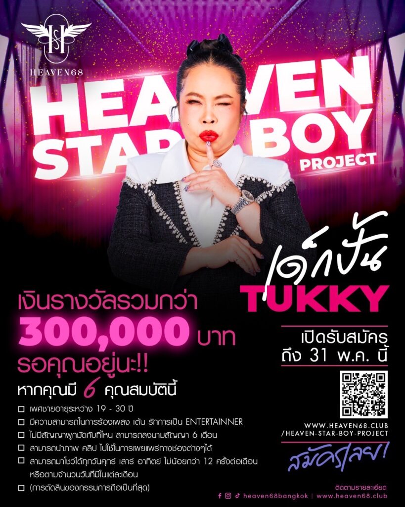 เช็คลิสต์ให้พร้อม ถ้าคุณเป็นชายหนุ่มที่ใช่ มีลีลาดี เต้นโดนใจ เอ็นเตอร์เทนเก่ง อายุระหว่าง 19-30 ปี ส่งคลิปการแสดง ความยาวไม่เกิน 3 นาที พร้อมรายละเอียดต่าง ๆ มาที่ https://www.heaven68.club/heaven-star-boy-project/ ชิงเงินรางวัลรวมกว่า 300,000 บาท สมัครได้ตั้งแต่วันนี้ – 31 พ.ค. 68 สามารถติดตามรายละเอียดหรือสอบถามเพิ่มเติมได้ทาง https://www.facebook.com/HEAVEN68BANGKOK แล้วมาลุ้นกันว่าใครจะได้ก้าวมาเป็น ‘เด็กปั้นตุ๊กกี้’